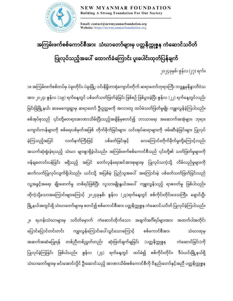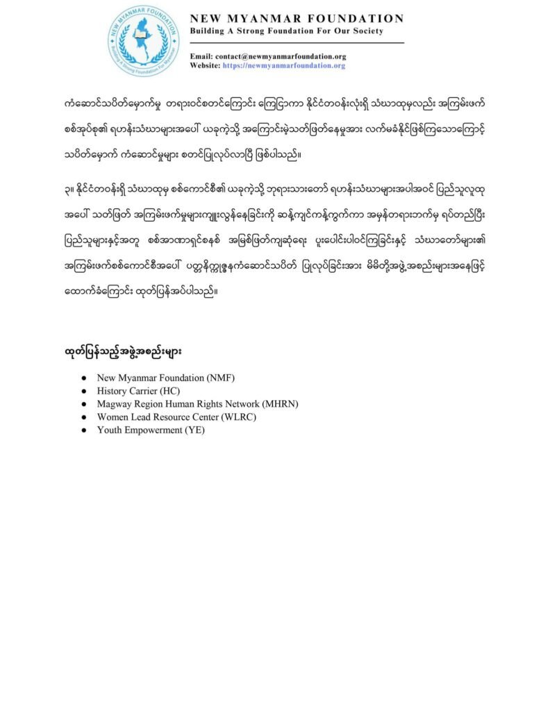 အကြမ်းဖက်စစ်ကောင်စီအား သံဃာတော်များမှ ပတ္တနိက္ကုဇ္ဇန ကံဆောင်သပိတ် ပြုလုပ်သည့်အပေါ် ထောက်ခံကြောင်း New Myanmar Foundation နှင့် မိတ်ဖက်အဖွဲ့အစည်းများမှပူးပေါင်းထုတ်ပြန်ချက်