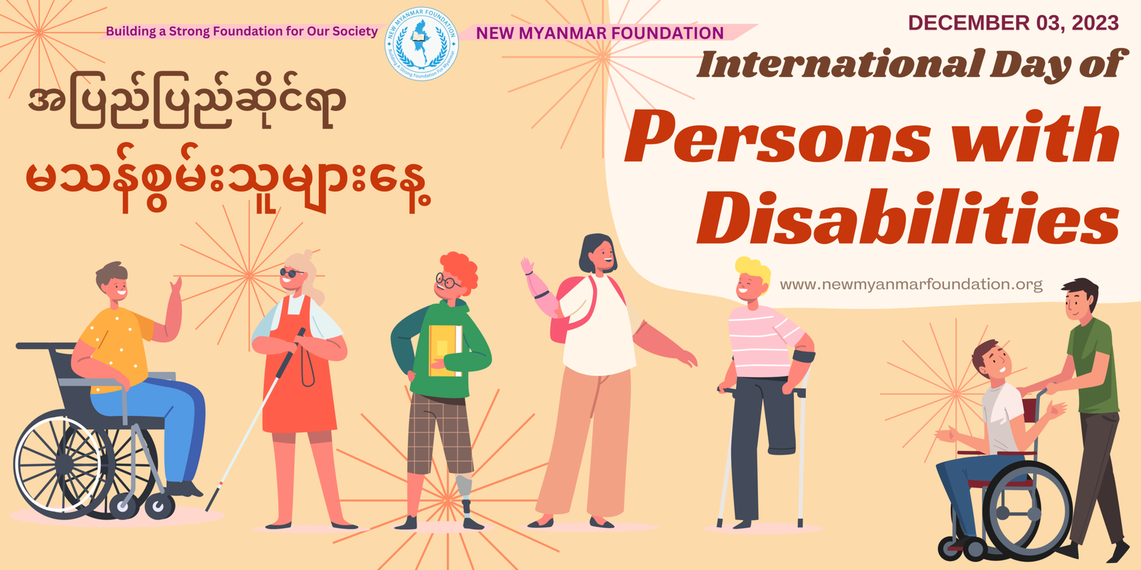 ယမန်နေ့ ဒီဇင်ဘာလ ( ၃ ) ရက်၊ ၂၀၂၃ ခုနှစ်တွင်ကျရောက်သော အပြည်ပြည်ဆိုင်ရာ မသန်စွမ်းသူများနေ့ အထိမ်းအမှတ် စကားဝိုင်းဆွေးနွေးပွဲ အခမ်းအနားအား New Myanmar Foundation မှ ဦးစီး၍ ထိုင်း – မြန်မာ နယ်စပ် တစ်နေရာတွင် ကျင်းပပြုလုပ်ခဲ့ပါသည်။ အခမ်းအနားတွင် ပထမဦးစွာ New Myanmar Foundation ၏ Executive Director ‌ဒေါက်တာစန်းအောင်မှ မသန်စွမ်းသူများအားဖေးမ၍ တန်းတူညီမျှဆက်ဆံရေး စသည့် အကြောင်းအရာများဖြင့် အဖွင့်နှုတ်ခွန်းဆက်စကား ပြောကြားဆွေး‌နွေးခဲ့ပါသည်။ ဆက်လက်၍ အထူးဖိတ်ကြားထားသော မြန်မာ့ဒီမိုကရေစီအရေး နှင့် လူ့အခွင့်အရေးတက်ကြွလှုပ်ရှားသူ မသန်စွမ်း အမျိုးသား/အမျိူးသမီးများမှ Online မှတဆင့်လည်းကောင်း၊ ဆွေးနွေးပွဲကျင်းပရာ အခမ်းအနားသို့ ကိုယ်တိုင်တက်ရောက်၍လည်းကောင်း ဆွေးနွေးခဲ့ကြပြီး အခြားသော ဖိတ်ကြားထားသည့် ဧည့်သည်များမှလည်း မသန်စွမ်းသူများအပေါ် လူသားချင်းစာနာမှုရှိရေး၊ ၎င်းတို့၏စိတ်ပိုင်းဆိုင်ရာ၊ ရုပ်ပိုင်းဆိုင်ရာပြန်လည်ထူထောင်ရေး စသည့် ကဏ္ဍအသီးသီးနှင့်ပတ်သတ်၍ မျှဝေဆွေးနွေးခဲ့ကြပါသည်။