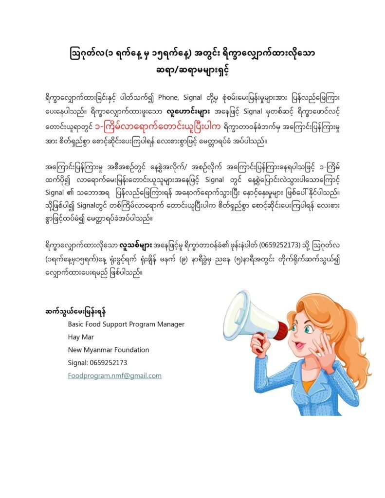 ရိက္ခာလျှောက်ထားခြင်းနှင့် ပါတ်သက်၍ Phone, Signal တို့မှ စုံစမ်းမေးမြန်းမှုများအား ပြန်လည်ဖြေကြား ပေးနေပါသည်။ ရိက္ခာလျှောက်ထားဖူးသော လူဟောင်းများ အနေဖြင့် Signal မှတစ်ဆင့် ရိက္ခာဖောင်လင့် တောင်းယူရာတွင် ၁-ကြိမ်လာရောက်တောင်းယူပြီးပါက ရိက္ခာတာဝန်ခံဘက်မှ အကြောင်းပြန်ကြားမှု အား စိတ်ရှည်စွာ စောင့်ဆိုင်းပေးကြပါရန် လေးစားစွာဖြင့် မေတ္တာရပ်ခံ အပ်ပါသည်။