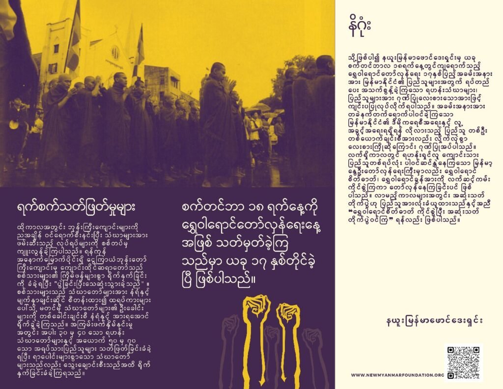 ၂၀၂၄ခုနှစ်၊ စက်တင်ဘာလ (၁၈) ရက်နေ့တွင် ကျရောက်သော “(၁၇) နှစ်ပြည့် ရွှေဝါရောင်တော်လှန်ရေးနေ့ အထိမ်း အမှတ် အခမ်းအနားပွဲအား New Myanmar Foundation မှ ဦးစီး၍ ထိုင်း-မြန်မာနယ်စပ် တနေရာတွင် ကျင်းပပြုလုပ် ခဲ့ပါသည်။