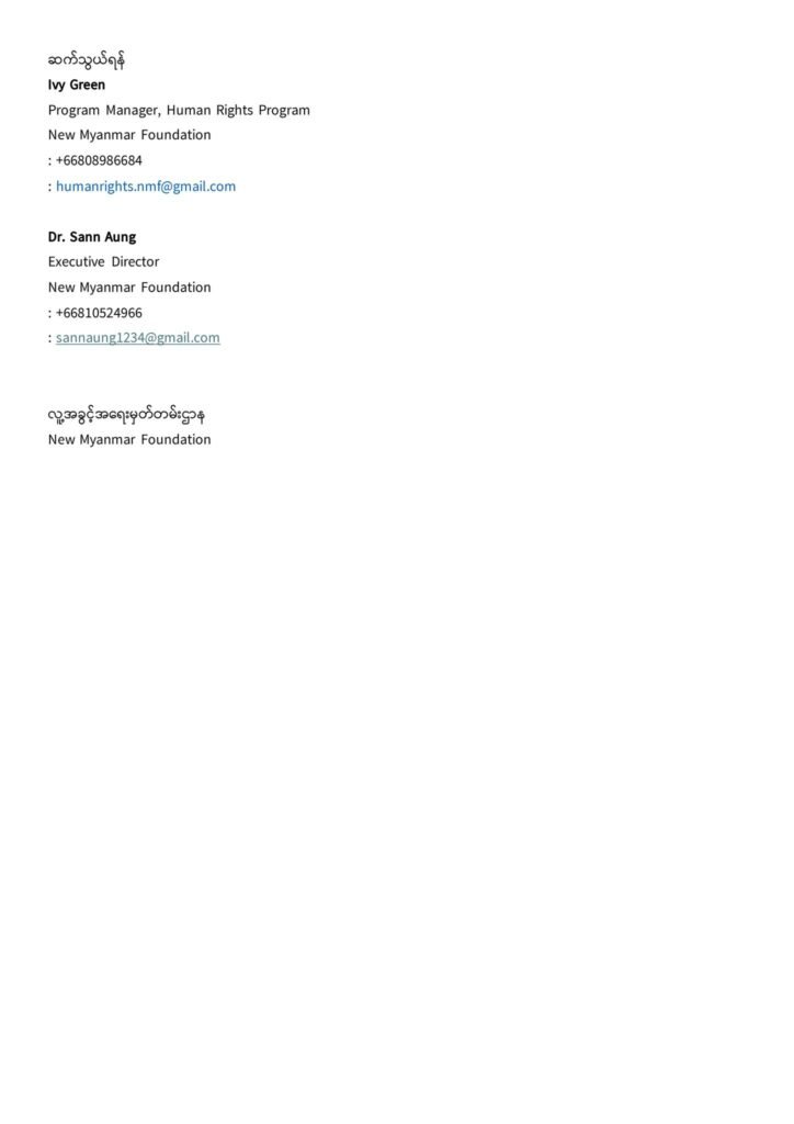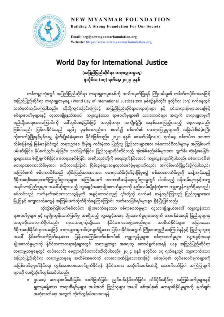 ၂၀၂၄ ခုနှစ် ဇူလိုင်လ (၁၇)ရက် အပြည်ပြည်ဆိုင်ရာ တရားမျှတမှုနေ့ အထိမ်းအမှတ် နယူးမြန်မာဖောင်ဒေးရှင်း၊ လူ့အခွင့်အရေးအစီအစဉ် နှင့် မိတ်ဖက်အဖွဲ့အစည်းများမှ သဘောထားပူးတွဲထုတ်ပြန်ချက်