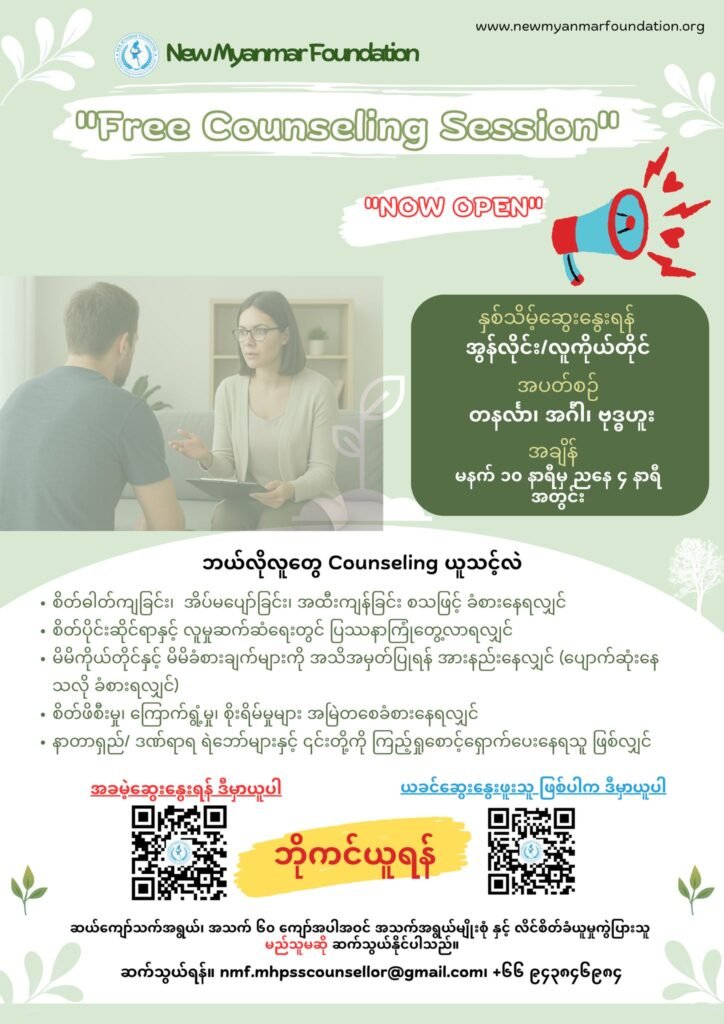 နယူးမြန်မာဖောင်ဒေးရှင်းအနေဖြင့် မြန်မာပြည်အတွင်း စီးပွားရေး၊ နိုင်ငံရေး၊ လူမှုရေးနှင့် လုံခြုံရေး ဖိအား အမျိုးမျိုးကြောင့် ထိုင်းနိုင်ငံ၊ မဲဆောက်မြို့သို့ ထွက်ပြေးရောက်ရှိလာသော မြန်မာပြည်သူများ၏ စိတ်ပိုင်းဆိုင်ရာ ထိခိုက်နာကျင်မှုများအတွက် Free counselling session (အခမဲ့နှစ်သိမ့်ဆွေးနွေးခြင်း အစီအစဥ်အား ၂၀၂၅ခုနှစ် မေလမှ စတင်၍ အပတ်စဥ် တနင်္လာ၊ အင်္ဂါ၊ ဗုဒ္ဓဟူးနေ့ များတွင် မနက် (၁၀နာရီမှ ညနေ ၄နာရီ) အတွင်းပြုလုပ်ပေးလျှက်ရှိနေပါသည်။