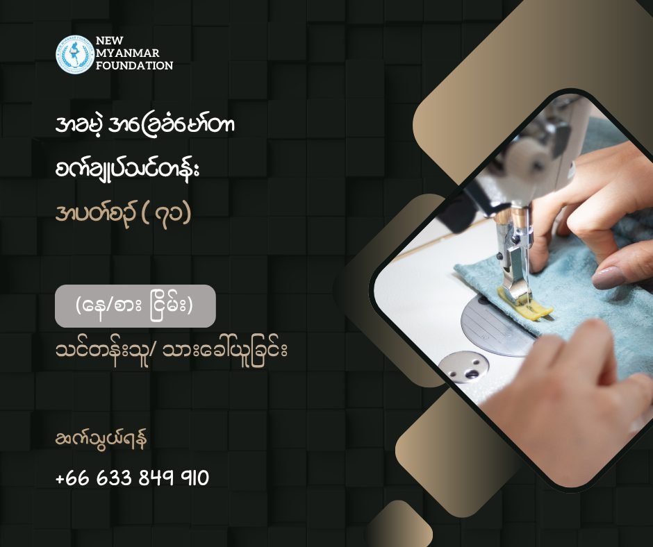 ထိုင်းနိုင်ငံ၊ မဲဆောက်မြို့သို့ ရောက်ရှိနေကြသောမြန်မာပြည်သူများအတွက် အလုပ်အကိုင်အခွင့် အလမ်းရရှိစေရန်ရည်ရွယ်၍နယူးမြန်မာဖောင်ဒေးရှင်းမှ “အခမဲ့အခြေခံမော်တာစက်ချုပ်သင်တန်း” များကို ၂၀၂၁ခုနှစ်၊ ဧပြီလမှစတင်၍ ဖွင့်လှစ်သင်ကြားပေးလျက်ရှိရာ ၂၀၂၅ ခုနှစ်၊ နိုဝင်ဘာလ ၁၇ ရက်နေ့မှ ၂၈ ရက်နေ့ အထိ သင်ကြားသွားမည့် သင်တန်းအပတ်စဉ် (၇၁)အတွက် သင်တန်းသား/သူ အသစ် (၁၀)ဦး ထပ်မံခေါ်ယူ သွားမည် ဖြစ်ပါသည်။ ယခုသင်တန်းတွင် လူမျိုးရေး၊ ဘာသာရေး ခွဲခြားမူမရှိဘဲအမျိုးသမီးများနှင့်အမျိုးသားများ အားလုံး ဝင်ရောက် လျှောက် ထားနိုင်ပါသည်။