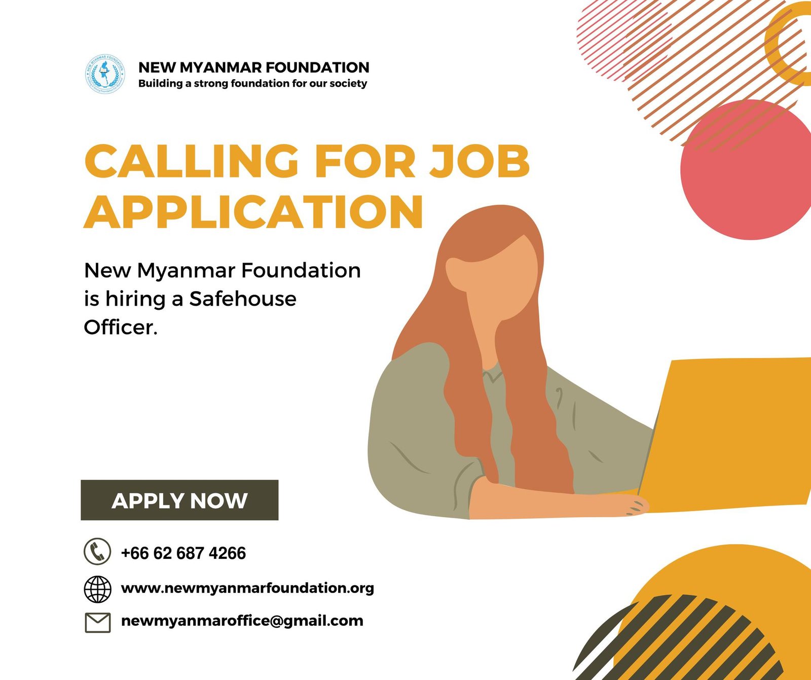 New Myanmar Foundation แ€žแ€Šแ€บ แ‚แ€แ‚แ แ€แ€ฏแ€”แ€พแ€…แ€บแ€™แ€พ แ€šแ€”แ€ฑแ€ทแ€กแ€‘แ€ญ แ€™แ€ผแ€”แ€บแ€™แ€ฌแ€”แ€ญแ€ฏแ€„แ€บแ€„แ€ถแ€™แ€พ แ€‘แ€ฝแ€€แ€บแ€•แ€ผแ€ฑแ€ธ แ€แ€ญแ€™แ€บแ€ธแ€›แ€พแ€ฑแ€ฌแ€„แ€บแ€œแ€ฌแ€žแ€ฑแ€ฌ แ€™แ€ผแ€”แ€บแ€™แ€ฌแ€”แ€ญแ€ฏแ€„แ€บแ€„แ€ถแ€žแ€ฌแ€ธแ€กแ€แ€ฝแ€€แ€บ แ€”แ€ฑแ€›แ€ฌแ€‘แ€ญแ€ฏแ€„แ€บแ€แ€„แ€บแ€ธแ€™แ€ปแ€ฌแ€ธ แ€‘แ€ฑแ€ฌแ€€แ€บแ€•แ€ถแ€ทแ€•แ€ฑแ€ธแ€žแ€Šแ€ทแ€บ (Safe House) แ€กแ€…แ€ฎแ€กแ€…แ€ฅแ€บแ€กแ€ฌแ€ธ แ€†แ€ฑแ€ฌแ€„แ€บแ€›แ€ฝแ€€แ€บแ€œแ€ปแ€€แ€บแ€›แ€พแ€ญแ€•แ€ซแ€žแ€Šแ€บแ‹ แŽแ€„แ€บแ€ธแ€กแ€…แ€ฎแ€กแ€…แ€‰แ€บแ€กแ€แ€ฝแ€€แ€บแ€แ€”แ€บแ€‘แ€™แ€บแ€ธ (Program Officer) แ€œแ€ปแ€พแ€ฑแ€ฌแ€€แ€บแ€œแ€ฝแ€พแ€ฌแ€™แ€ปแ€ฌแ€ธ แ€แ€ฑแ€ซแ€บแ€šแ€ฐแ€”แ€ฑแ€•แ€ซแ€žแ€Šแ€บแ‹
