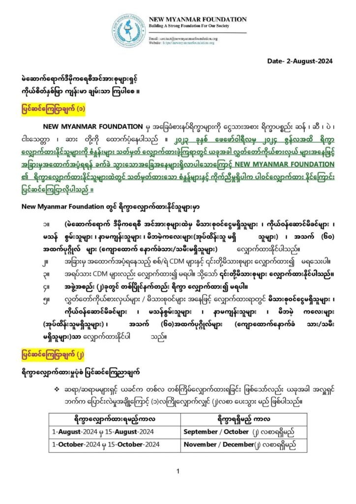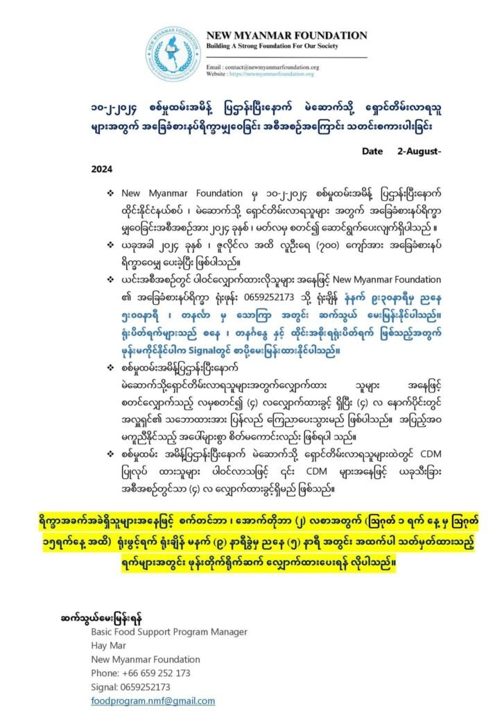 New Myanmar Foundation ၏ အခြေခံစားနပ်ရိက္ခာမျှဝေခြင်းအစီအစဉ်တွင် ၂၀၂၄ ခုနှစ် ၊ မတ်လ မှစတင်၍ မဲဆောက်ရောက် ဒီမိုကရေစီအရေးကြိုးပမ်းသူများအတွက် နှင့် စစ်မှု မထမ်းလို၍ ပြည်တွင်းမှ မဲဆောက်သို့ရှောင်တိမ်းလာသည့်သူများအတွက်ဟူ၍ ရိက္ခာ လျှောက် ထားမှု ကအား (၂) မျိုး ခွဲ၍ ဆောင်ရွက်ပေးလျက် ရှိပါသည် ။