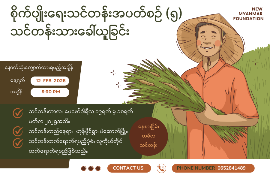မှတ်ချက်။ ။ New Myanmar Foundation မှ စိုက်ပျိုးရေးသင်တန်းများအား ၂၅ ရက်၊ နိုဝင်ဘာလ၊ ၂၀၂၄ ခုနှစ်မှစတင်ခဲ့ရာ ယခုအခါအပတ်စဉ် (၄)ခုအား အောင်မြင်စွာသင်တန်းပို့ချပေးခဲ့ပြီး သင်တန်းသား/သူ (၃၂)ဦးအား မွေးထုတ်နိုင်ခဲ့ပြီဖြစ်ပါသည်။