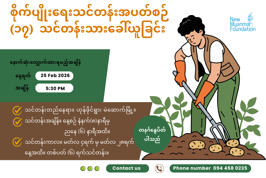 မှတ်ချက်။ ။ New Myanmar Foundation မှ စိုက်ပျိုးရေးသင်တန်းများအား ၂၅ ရက်၊ နိုဝင်ဘာလ၊ ၂၀၂၄ ခုနှစ်မှစတင်ခဲ့ရာ ယခုအခါအပတ်စဉ် (၁၆)ခုအား အောင်မြင်စွာသင်တန်းပို့ချပေးခဲ့ပြီး သင်တန်းသား/ သူ (၁၈၃) ဦးအား မွေးထုတ်နိုင်ခဲ့ပြီးဖြစ်ပါသည်။