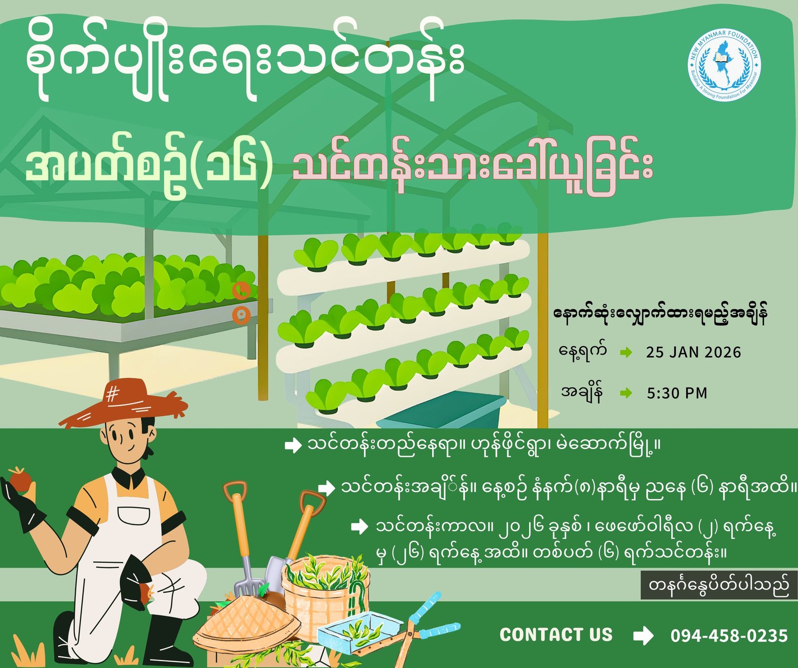 မှတ်ချက်။ ။ New Myanmar Foundation မှ စိုက်ပျိုးရေးသင်တန်းများအား ၂၅ ရက်၊ နိုဝင်ဘာလ၊ ၂၀၂၄ ခုနှစ်မှစတင်ခဲ့ရာ ယခုအခါအပတ်စဉ် (၁၅)ခုအား အောင်မြင်စွာသင်တန်းပို့ချပေးခဲ့ပြီး သင်တန်းသား/ သူ (၁၆၉) ဦးအား မွေးထုတ်နိုင်ခဲ့ပြီးဖြစ်ပါသည်။