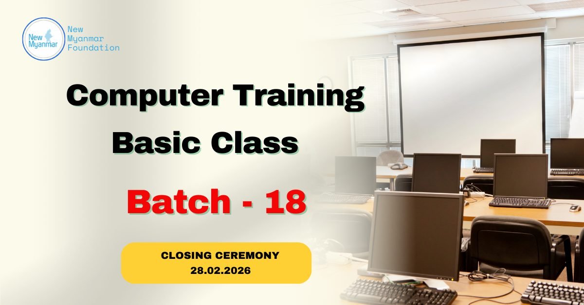 ၂၀၂၆ခုနှစ်၊ ဖေဖော်ဝါရီလ(၁၈)ရက်နေ့မှ ဖေဖော်ဝါရီလ(၂၈) ရက်နေ့အထိ(၁၀) ရက်ကြာ ဖွင့်လှစ်သင်ကြား ပေးခဲ့သော New Myanmar Foundation ၏ အခမဲ့အခြေခံ ကွန်ပျူတာသင်တန်း အပတ်စဉ် (၁၈) သင်တန်းဆင်းပွဲ အခမ်းအနားကို ၂၀၂၆ခုနှစ်၊ ဖေဖော်ဝါရီလ (၂၈)ရက်နေ့ ညနေ (၀၄း၀၀) နာရီတွင် ထိုင်း-မြန်မာနယ်စပ်ဒေသရှိ နယူးမြန်မာ ဖောင်ဒေးရှင်း၏ ကွန်ပျူတာ သင်တန်းခန်းမတွင် ကျင်းပပြုလုပ်ခဲ့ပါသည်။