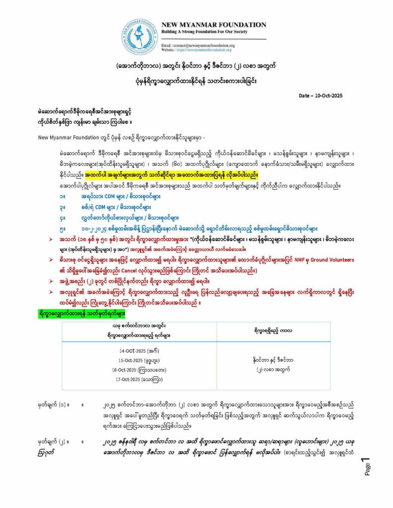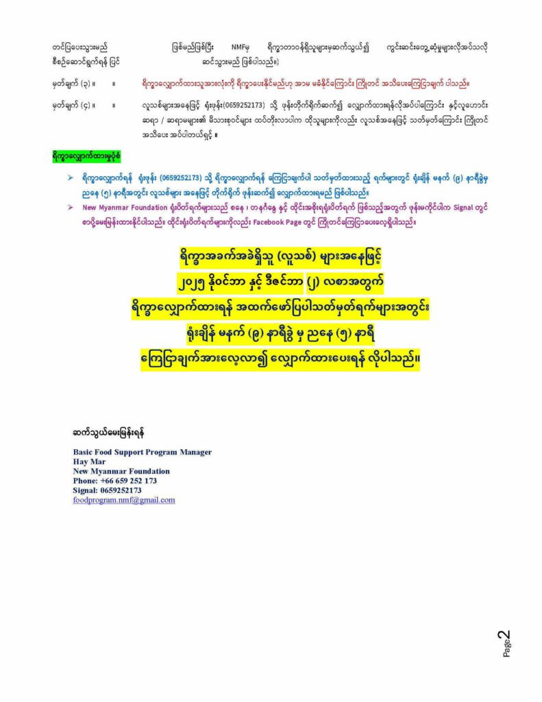 မိသားစု ဝင်ငွေရှိသူများ အနေဖြင့် လျှောက်ထား၍ မရပါ။ ရိက္ခာလျှောက်ထားသူများ၏ ထောက်ခံပုဂ္ဂိုလ်များအပြင် NMF မှ Ground Volunteers ၏ သိရှိမှုပေါ်အခြေခံ၍လည်း Cancel လုပ်သွားမည်ဖြစ်ကြောင်း ကြိုတင် အသိပေးအပ်ပါသည်။)