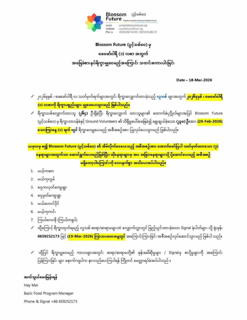 ရိက္ခာသစ်လျှောက်ထားသူ (၂၆၄) ဦးရှိခဲ့ပြီး ရိက္ခာလျှောက် ထားသူများ၏ ထောက်ခံပုဂ္ဂိုလ်များအပြင် Blossom Future (ပွင့်သစ်ဝေ) မှ ရိက္ခာတာဝန်ခံနှင့် Ground Volunteers ၏ သိရှိမှုပေါ်အခြေခံ၍ ရွေးချယ်ခဲ့သော (၂၃၀) ဦးအား (20-March-2026) သောကြာနေ့ (၁) ရက် တွင် ရိက္ခာဝေမျှပေးမည့် အစီအစဉ်အား ပြုလုပ်ပေးသွားမည် ဖြစ်ပါသည်။