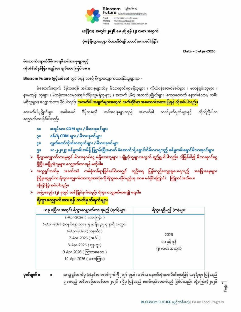Blossom Future (ပွင့်သစ်ဝေ) တွင် ပုံမှန် လစဉ် ရိက္ခာလျှောက်ထားနိုင်သူများမှာ –