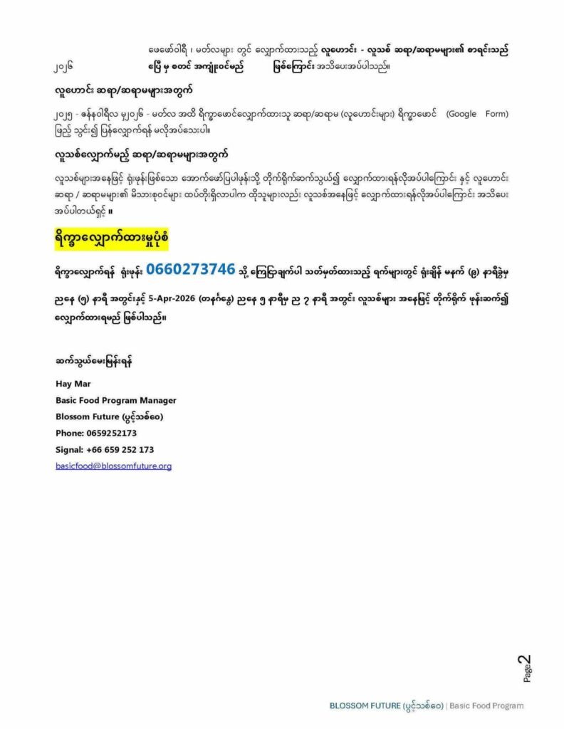 ရိက္ခာလျှောက်ရန် ရုံးဖုန်း 0660273746 သို့ ကြေငြာချက်ပါ သတ်မှတ်ထားသည့် ရက်များတွင် ရုံးချိန် မနက် (၉) နာရီခွဲမှ ညနေ (၅) နာရီ အတွင်းနှင့် 5-Apr-2026 (တနင်္ဂနွေ) ညနေ ၅ နာရီမှ ည ၇ နာရီ အတွင်း လူသစ်များ အနေဖြင့် တိုက်ရိုက် ဖုန်းဆက်၍ လျှောက်ထားရမည် ဖြစ်ပါသည်။