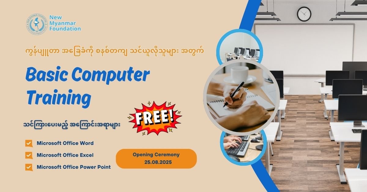 ထိုင်းနိုင်ငံ မဲဆောက်မြို့သို့ အကြောင်းအမျိုးမျိုးကြောင့် ရောက်ရှိလာကြသည့် မြန်မာပြည်သူ/ ပြည်သားများအတွက် ကျောင်းတက်ခြင်း နှင့် အလုပ်အကိုင် ရှာဖွေရာတွင် အထောက်အကူ ဖြစ်စေရန် နှင့် လက်ရှိလုပ်ငန်းခွင် ဝင်ရောက်နေသူများအနေဖြင့် နေ့စဉ်ရုံးလုပ်ငန်းဆောင်တာများ လုပ်ဆောင်ရာတွင် ပိုမိုထိရောက်လွယ်ကူစေရန် ရည်ရွယ်၍ 𝐍𝐞𝐰 𝐌𝐲𝐚𝐧𝐦𝐚𝐫 𝐅𝐨𝐮𝐧𝐝𝐚𝐭𝐢𝐨𝐧 မှ အခမဲ့အခြေခံကွန်ပျူတာသင်တန်းများကို ဧပြီလ ၂၀၂၅ ခုနှစ်မှ စတင်၍ ဖွင့်လှစ်သင်ကြားပေးခဲ့ရာမှာ ယခုအခါ အပတ်စဉ် (၉) အထိ ရောက်ရှိခဲ့ပြီဖြစ်ပြီး ယခုအပတ်စဉ် (၉) အတွက် သင်တန်းသား ခေါ်ယူနေပြီဖြစ်ကြောင်း သတင်းကောင်းပါးအပ်ပါသည်။