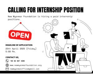 နယူးမြန်မာဖောင်ဒေးရှင်း (New Myanmar Foundation) ၏ စိတ်ခံစားမှုနှင့် လူမှုဘဝဝန်းကျင်ကျန်းမာပျော်ရွှင်ခြင်း အပြန်အလှန်လွှမ်းမှုပိုင်ဆိုင်ရာ လုပ်ငန်းအစီအစဉ် 𝐌𝐇𝐏𝐒𝐒 𝐏𝐫𝐨𝐠𝐫𝐚𝐦) အတွက် အကြံပေးသူ (𝐂𝐨𝐮𝐧𝐬𝐞𝐥𝐨𝐫) ခေါ်ယူခြင်း April 23, 2025 Read More »