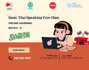 အွန်လိုင်းထိုင်းဘာသာစကားပြော အခမဲ့သင်တန်း အပတ်စဥ် (၁၄) အတွက်သင်တန်းသားခေါ်ယူခြင်း June 11, 2025 Read More »