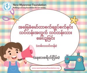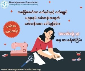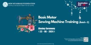 New Myanmar Foundation မှ စီစဉ်သည့် အခမဲ့အခြေခံမော်တာ စက်ချုပ်သင်တန်း အပတ်စဉ် (၃) တက်ရောက်နိုင်ရန် သင်တန်းသား/ သူခေါ်ယူခြင်း။ June 5, 2024 Read More »