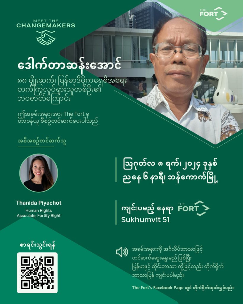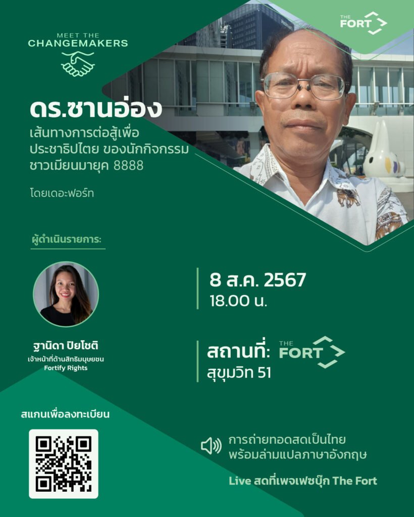 มาพบกับ ดร. สาน อ่อง นักเคลื่อนไหวเพื่อประชาธิปไตยและผู้อำนวยการ New Myanmar Foundation เพื่อเรียนรู้เกี่ยวกับการทำงานตลอดชีวิตของเขาเพื่อประชาธิปไตยในเมียนมาที่ The Fort ![]()
