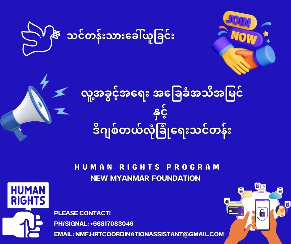 နယူးမြန်မာဖောင်ဒေးရှင်းမှ ၂၀၂၅ ခုနှစ် ဧပြီလ (၂၁) ရက်နေ့တွင် စတင်ဖွင့်လှစ်ပို့ချပေးမည့် လူ့အခွင့်အရေးအခြေခံနှင့် ဒီဂျစ်တယ် ဘေးကင်းလုံခြုံရေးသင်တန်းသို့ တက်ရောက်လိုသူများအနေနဲ့ အောက်ပါ 𝗚𝗼𝗼𝗴𝗹𝗲 𝗙𝗼𝗿𝗺 တွင် 𝗥𝗲𝗴𝗶𝘀𝘁𝗲𝗿 လုပ်နိုင်ပါသည်။ အဆိုပါသင်တန်းအတွက် ယခုလျှောက်လွှာ ခေါ်ယူခြင်းမှ သတ်မှတ်ချက်နှင့်ကိုက်ညီသူများကို ရွေးချယ်ကာ ဆက်သွယ်တက်ရောက်စေမည် ဖြစ်ပါသည်။