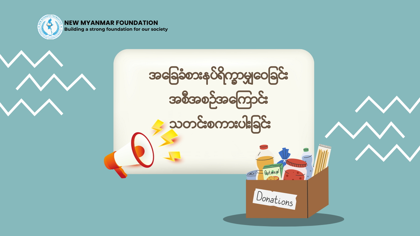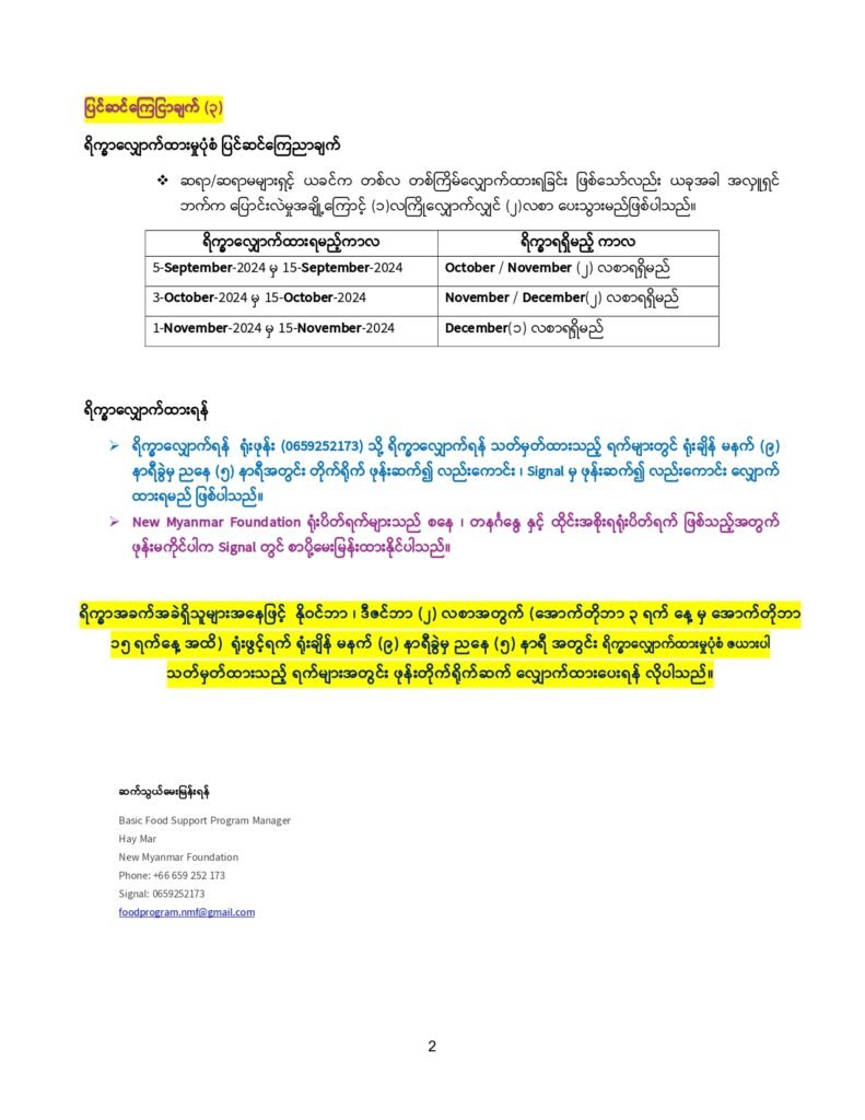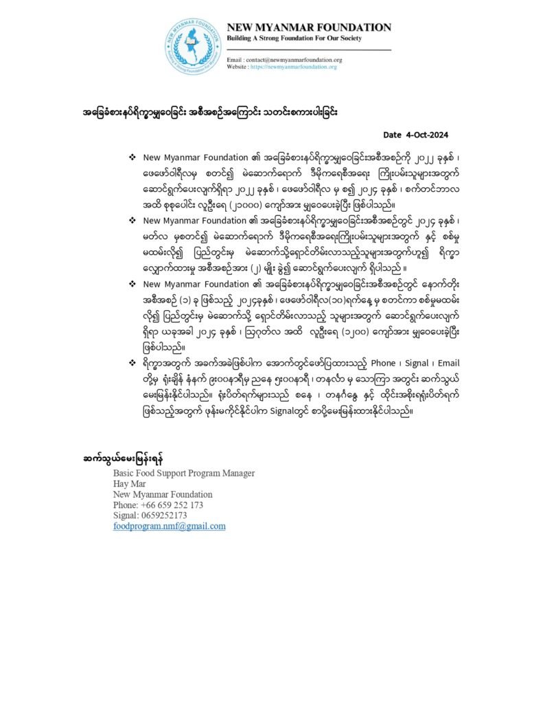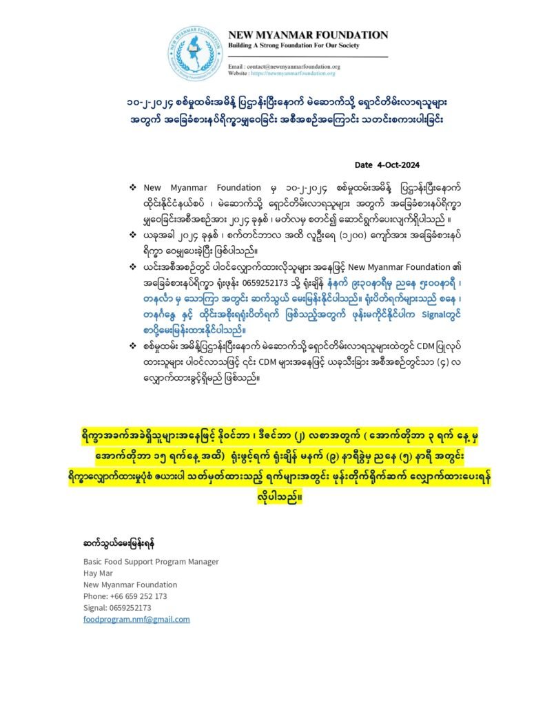 - New Myanmar Foundation ၏ အခြေခံစားနပ်ရိက္ခာမျှဝေခြင်းအစီအစဉ်တွင် ၂၀၂၄ ခုနှစ် ၊ မတ်လ မှစတင်၍ မဲဆောက်ရောက် ဒီမိုကရေစီအရေးကြိုးပမ်းသူများအတွက် နှင့် စစ်မှု မထမ်းလို၍ ပြည်တွင်းမှ မဲဆောက်သို့ရှောင်တိမ်းလာသည့်သူများအတွက်ဟူ၍ ရိက္ခာ လျှောက်ထားမှု အစီအစဉ်အား (၂) မျိုး ခွဲ၍ ဆောင်ရွက်ပေးလျက် ရှိပါသည် ။