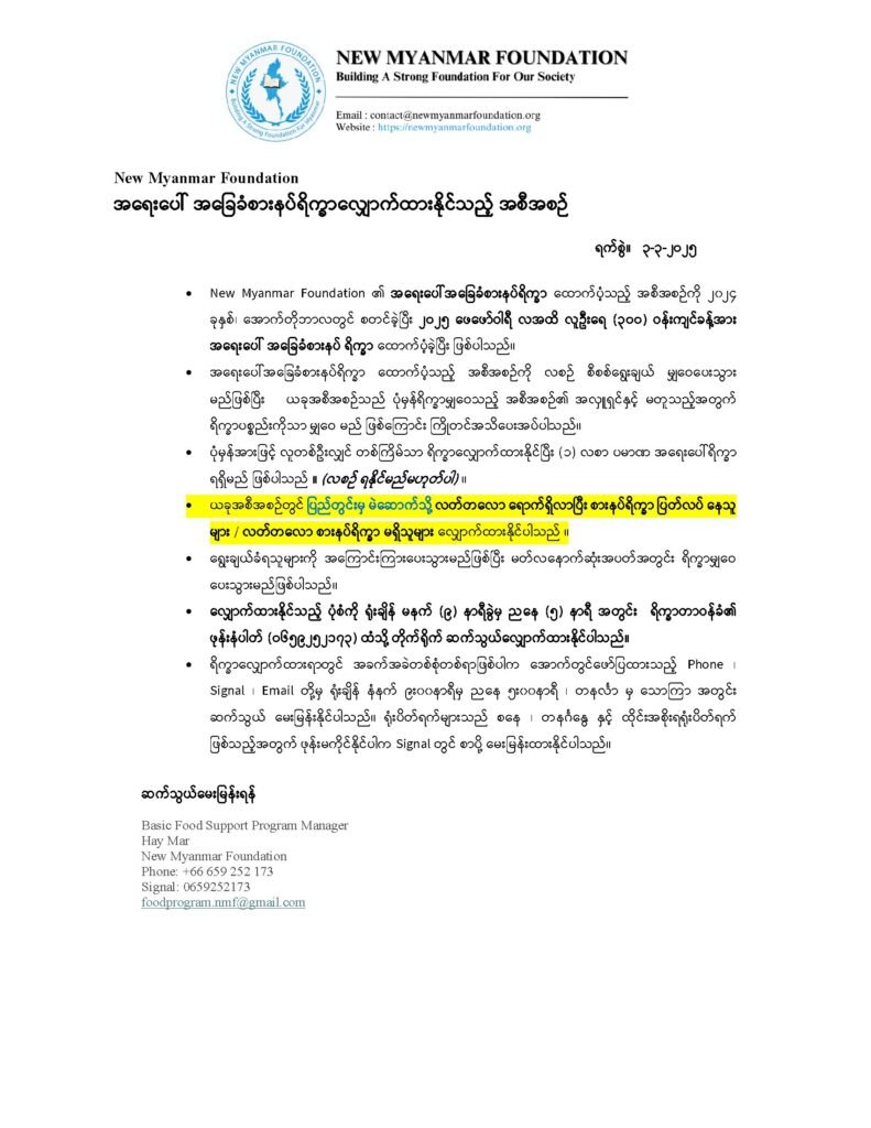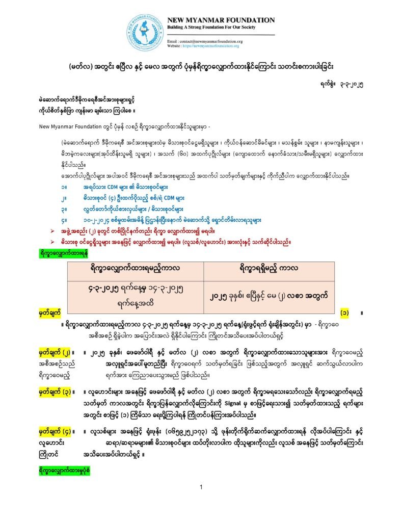 New Myanmar Foundation တွင် ပုံမှန် လစဉ် ရိက္ခာလျှောက်ထားနိုင်သူများမှာ –