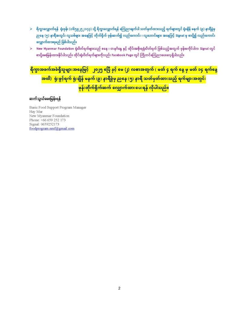 ရိက္ခာအခက်အခဲရှိသူများအနေဖြင့် ၂၀၂၅ ဧပြီ နှင့် ‌မေ (၂) လစာအတွက် ( မတ် ၄ ရက် နေ့ မှ မတ် ၁၄ ရက်နေ့ အထိ) ရုံးဖွင့်ရက် ရုံးချိန် မနက် (၉) နာရီခွဲမှ ညနေ (၅) နာရီ သတ်မှတ်ထားသည့် ရက်များအတွင်း ဖုန်းတိုက်ရိုက်ဆက် လျှောက်ထားပေးရန် လိုပါသည်။