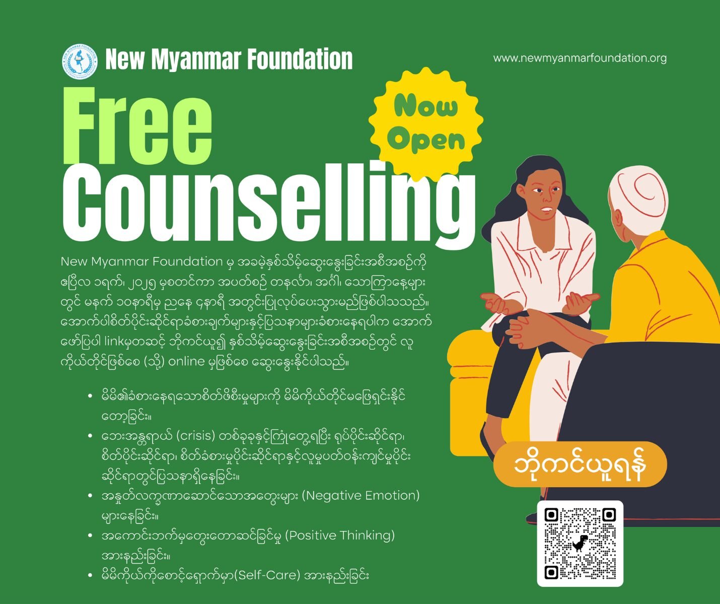 𝗡𝗲𝘄 𝗠𝘆𝗮𝗻𝗺𝗮𝗿 𝗙𝗼𝘂𝗻𝗱𝗮𝘁𝗶𝗼𝗻 မှ 𝗙𝗿𝗲𝗲 𝗰𝗼𝘂𝗻𝘀𝗲𝗹𝗹𝗶𝗻𝗴 𝘀𝗲𝘀𝘀𝗶𝗼𝗻 (အခမဲ့နှစ်သိမ့်ဆွေးနွေးခြင်းအစီအစဥ်) ကို