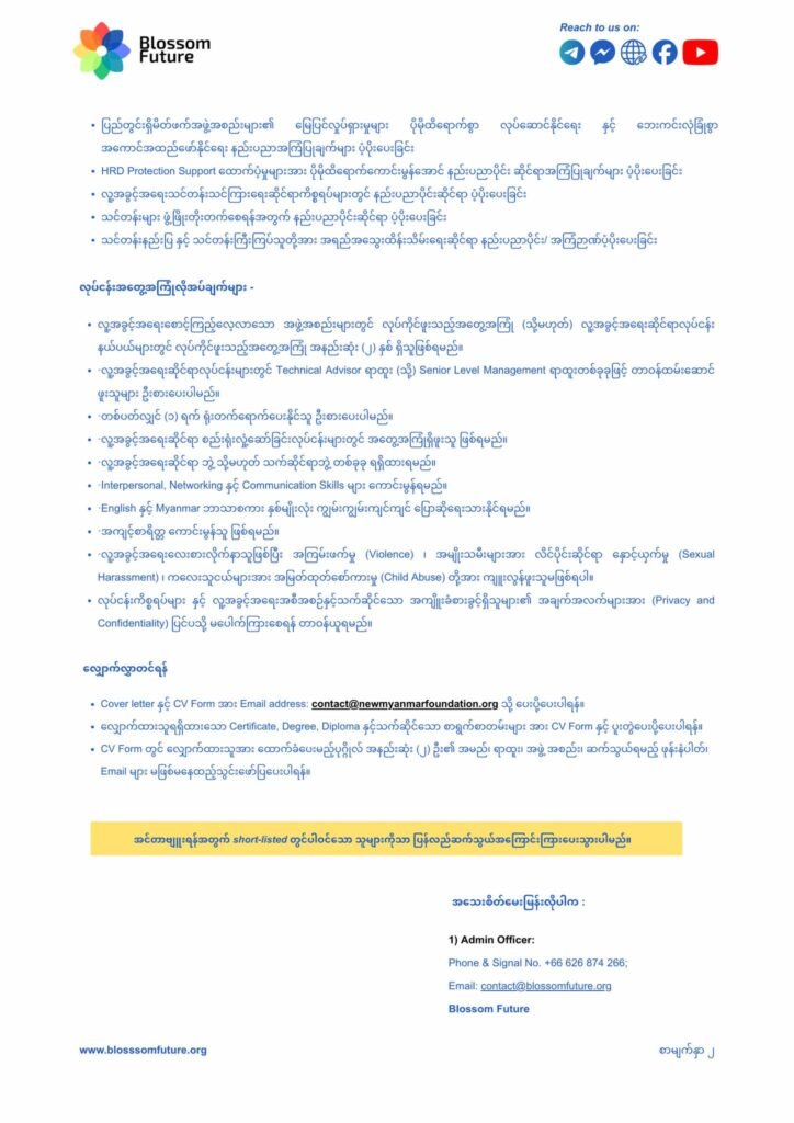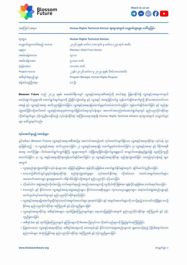 𝐁𝐥𝐨𝐬𝐬𝐨𝐦 𝐅𝐮𝐭𝐮𝐫𝐞 မှ 𝐇𝐮𝐦𝐚𝐧 𝐑𝐢𝐠𝐡𝐭𝐬 𝐓𝐞𝐜𝐡𝐧𝐢𝐜𝐚𝐥 𝐀𝐝𝐯𝐢𝐬𝐨𝐫 ရာထူးအတွက် အလုပ်ခေါ်ယူခြင်း