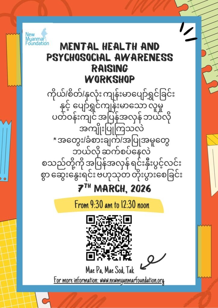 နယူးမြန်မာဖောင်ဒေးရှင်းအနေဖြင့် မြန်မာပြည်အတွင်း စီးပွားရေး၊ နိုင်ငံရေး၊ လူမှုရေးနှင့် လုံခြုံရေး ဖိအားအမျိုးမျိုးကြောင့် ထိုင်းနိုင်ငံ၊ မဲဆောက်မြို့သို့ ထွက်ပြေးရောက်ရှိလာသော မြန်မာပြည်သူများ အတွက် စိတ်၊ ခံစားမှုနှင့် လူမှုဘဝပတ်ဝန်းကျင် ကျန်းမာပျော်ရွှင်ခြင်း အပြန်အလှန်လွှမ်းမိုးမှု ပိုင်းဆိုင်ရာအသိပညာများ မျှဝေရန် ရည်ရွယ်ချက်ဖြင့် ယခုဆွေးနွေးပွဲအား ၂၀၂၅ခုနှစ် ဧပြီလမှ စတင်၍ လစဉ်ကျင်းပပြုလုပ်ပေးလျှက်ရှိပါသည်။ ၂၀၂၆ ခုနှစ် မတ်လအတွက် သင်တန်း ထပ်မံဖွင့်လှစ်မည်ဖြစ်ရာ သင်တန်းအား အမှန်တကယ် စိတ်ပါဝင်စားသော မည်သူမဆို တက်ရောက်နိုင်ရန် ယခုလျှောက်လွှားအား ဖြည့်သွင်းစာရင်းပေးနိုင်ပြီ ဖြစ်ပါသည်။