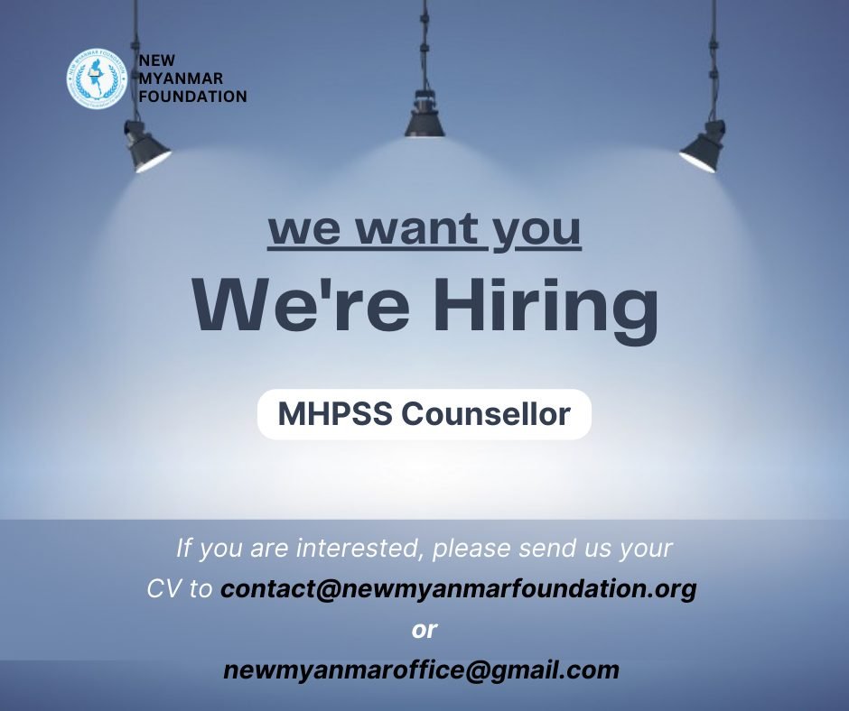 နယူးမြန်မာဖောင်ဒေးရှင်း (NMF) သည် စိတ်ခံစားမှုနှင့် လူမှုဘဝဝန်းကျင်ကျန်းမာပျော်ရွှင်ခြင်း အပြန်အလှန်လွှမ်းမှုပိုင်ဆိုင်ရာ ထောက်ပံ့မှုအစီအစဉ် (MHPSS Program) တွင် ပူးပေါင်းပါဝင်ဆောင်ရွက်ရန် တာဝန်ယူမှုရှိပြီး အရည်အချင်းပြည့်မီသော အကြံပေးသူတစ်ဦးကို ရှာဖွေနေပါသည်။ ဤအလုပ်အကိုင်သည် တစ်ဦးချင်းစီနှင့် လူ့အသိုင်းအဝိုင်းတို့၏ စိတ်ကျန်းမာရေး ကောင်းမွန်ရေးအတွက် အကြံဉာဏ်ပေးမှုဝန်ဆောင်မှုများနှင့် အသိပညာပေးလှုပ်ရှားမှုများမှတဆင့် ပါဝင်ကူညီနိုင်မည့် အခွင့်အရေးတရပ်လည်းဖြစ်ပါသည်။
