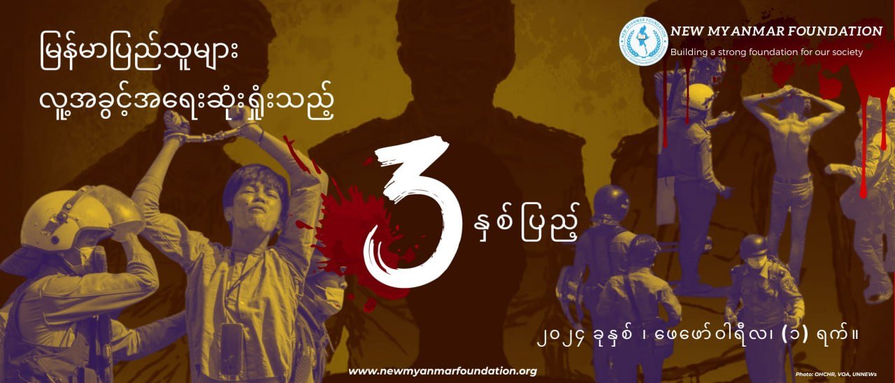 ဖေဖော်ဝါရီလ (၁) ရက်၊ ၂၀၂၄ ခုနှစ်တွင် မြန်မာပြည်သူ/သားများ လူ့အခွင့်အရေးဆုံးရှုံးခဲ့ရသည့် (၃)နှစ် ပြည့် campaign လှုပ်ရှားမှုအား New Myanmar Foundation မှ ဦးစီး၍ ထိုင်း-မြန်မာနယ်စပ် တနေရာတွင် ကျင်းပပြုလုပ်ခဲ့ပါသည်။ အခမ်းအနားတွင် ဦးစွာပထမ New Myanmar Foundation ၏ Executive Director ဒေါက်တာစန်းအောင်မှ အဖွင့်အမှာစကား ပြောကြားခဲ့ပြီး အထူးဖိတ်ကြား ထားသော ကရင်အမျိုးသားအစည်းအရုံးKNUမှ ခေါင်းဆောင်တစ်ဦး၊ဧရာဝတီတိုင်းဒေသကြီး အမျိုးသား ဒီမိုကရေစီအဖွဲ့ချုပ် တိုင်းတွဲဖက်အတွင်းရေးမှူး ဆရာမဒေါ်ခင်လှဌေး၊ သမိုင်း သယ်ဆောင်သူများအဖွဲ့ မှ ဆရာမဒေါ်ရီရီဆွေ၊ မေမေ့ရင်ခွင် ဖောင်ဒေးရှင်းမှ ဆရာဦးသန်းမြင့်အောင် တို့မှ အသီးသီး အမှာစကား များနှင့် မြန်မာနိုင်ငံစစ်အာဏာသိမ်းခံရခြင်းမှစ၍ မြန်မာပြည်သူ၊သားများ ၏ လူ့အခွင့်အရေးများ မည်သို့မည်ပုံ ဆုံးရှုံးခဲ့ရကြောင်း၊ ရှေ့ဆက်၍ လွတ်လပ်၍ တရားမျှတသော ဒီမိုကရေစီနိုင်ငံတော်သစ်ကြီး အမြန်ဆုံးရရှိရန် လက်တွဲကာ ရှေ့ဆက်တိုက်ပွဲဝင်ကြရန် လိုအပ် ကြောင်းတို့ကို အကျယ်တ၀င့်ပြောကြား ပေးခဲ့ကြပါသည်။