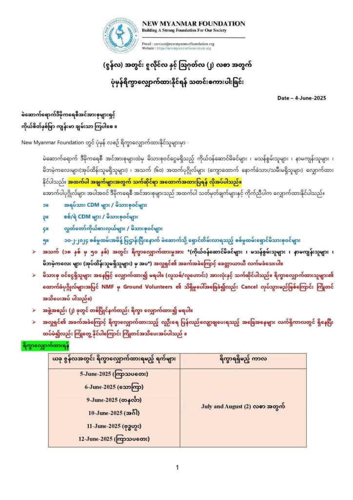 New Myanmar Foundation တွင် ပုံမှန် လစဉ် ရိက္ခာလျှောက်ထားနိုင်သူများမှာ –