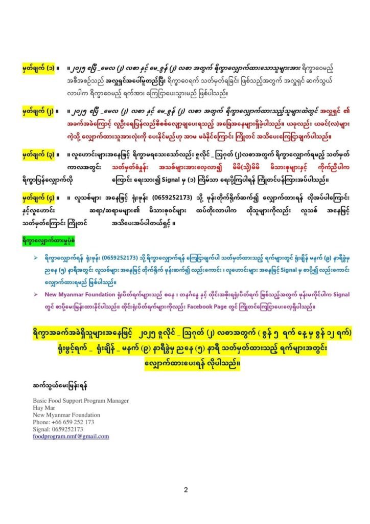 မိသားစု ဝင်ငွေရှိသူများ အနေဖြင့် လျှောက်ထား၍ မရပါ။ (လူသစ်/လူဟောင်း) အားလုံးနှင့် သက်ဆိုင်ပါသည်။ ရိက္ခာလျှောက်ထားသူများ၏ ထောက်ခံပုဂ္ဂိုလ်များအပြင် NMF မှ Ground Volunteers ၏ သိရှိမှုပေါ်အခြေခံ၍လည်း Cancel လုပ်သွားမည်ဖြစ်ကြောင်း ကြိုတင် အသိပေးအပ် ပါသည်။)