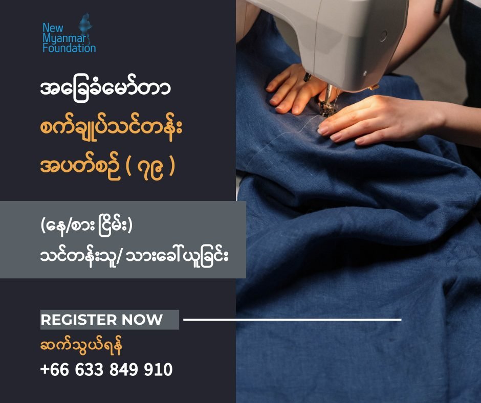 ထိုင်းနိုင်ငံ၊ မဲဆောက်မြို့သို့ ရောက်ရှိနေကြသောမြန်မာပြည်သူများအတွက် အလုပ်အကိုင်အခွင့် အလမ်းရရှိစေရန်ရည်ရွယ်၍နယူးမြန်မာဖောင်ဒေးရှင်းမှ “အခမဲ့အခြေခံမော်တာစက်ချုပ်သင်တန်း” များကို ၂၀၂၁ခုနှစ်၊ ဧပြီလမှစတင်၍ ဖွင့်လှစ်သင်ကြားပေးလျက်ရှိရာ ၂၀၂၆ ခုနှစ်၊ မတ်လ ၁၆ရက်နေ့မှ ၂၇ရက်နေ့ အထိ သင်ကြားသွားမည့် သင်တန်းအပတ်စဉ် (၇၉)အတွက် သင်တန်းသား/သူ အသစ် (၁၀)ဦး ထပ်မံခေါ်ယူ သွားမည် ဖြစ်ပါသည်။ ယခုသင်တန်းတွင် လူမျိုးရေး၊ ဘာသာရေး ခွဲခြားမူမရှိဘဲအမျိုးသမီးများနှင့်အမျိုးသားများ အားလုံး ဝင်ရောက် လျှောက် ထားနိုင်ပါသည်။