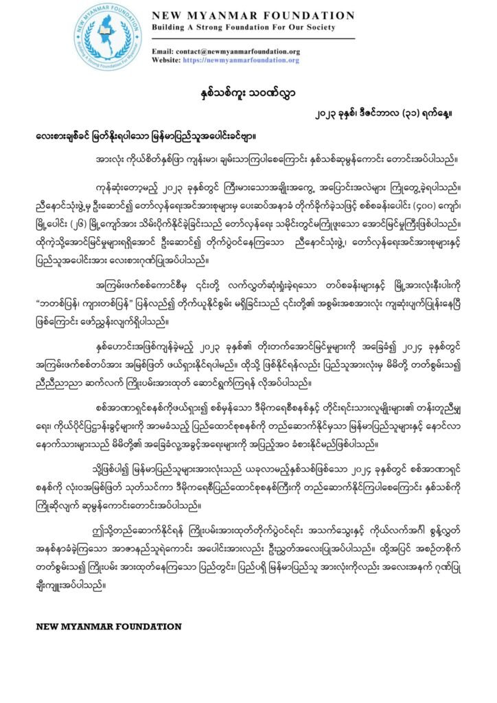 နောက်သားများသည် မိမိတို့၏ အခြေခံ လူ့အခွင့်အရေးများကို အပြည့်အဝ ခံစားနိုင်မည် ဖြစ်ပါသည် ။သို့ဖြစ်ပါ၍မြန်မာ ပြည်သူများအားလုံး သည် ယခုလာမည့်နှစ်သစ်ဖြစ်သော ၂၀၂၄ ခုနှစ်တွင် စစ်အာဏာရှင်စနစ်ကို လုံးဝ အမြစ်ဖြတ် သုတ်သင်ကာ ဒီမိုကရေစီပြည်ထောင်စုစနစ်ကြီးကို တည်ဆောက်နိုင်ကြပါစေကြောင်း နှစ်သစ်ကိုကြိုဆိုလျက် ဆုမွန်ကောင်းတောင်းအပ်ပါသည်။ဤသို့တည်ဆောက်နိုင်ရန် ကြိုးပမ်းအားထုတ်တိုက်ပွဲဝင်ရင်း