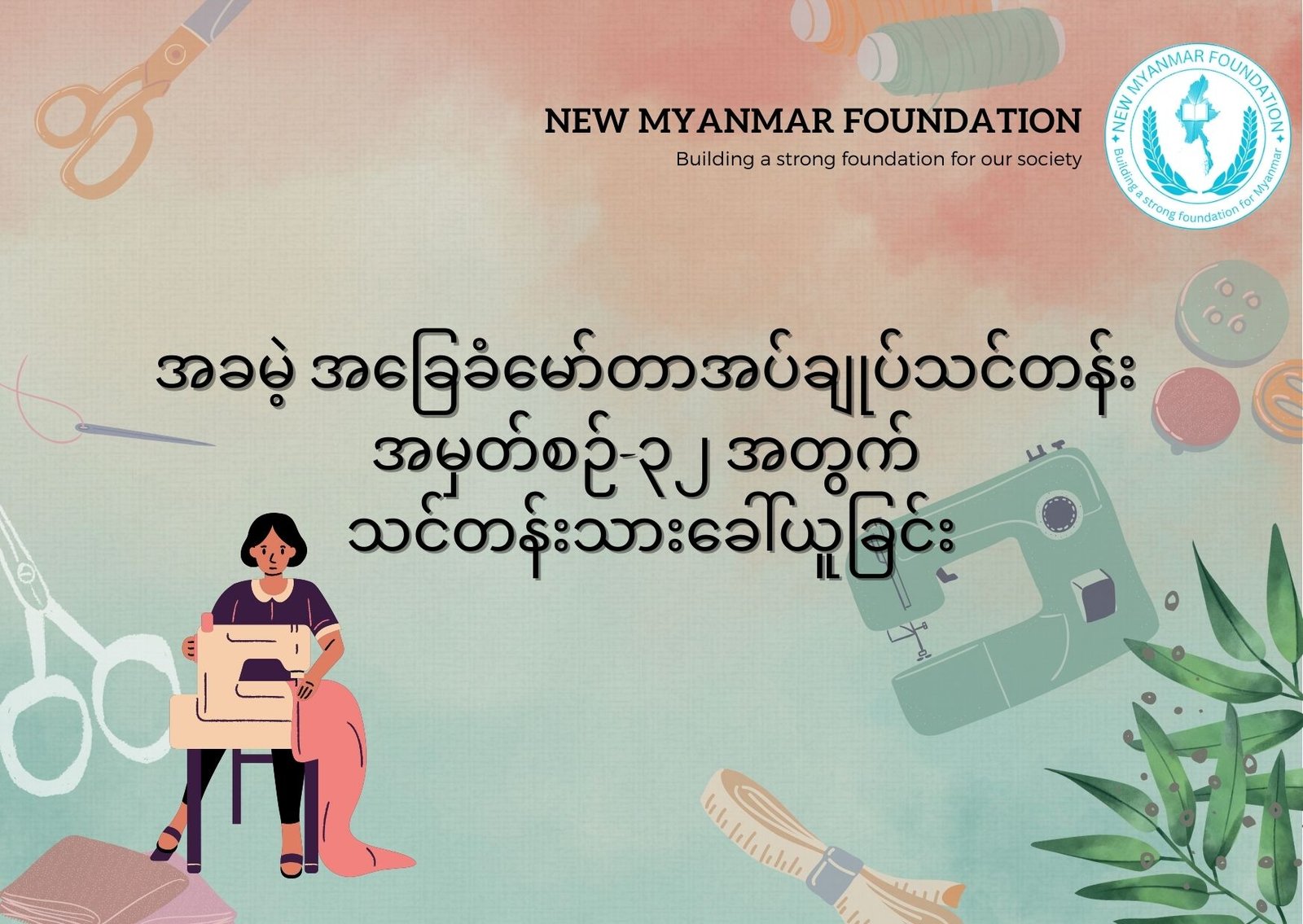 New Myanmar Foundation အနေဖြင့် မဲဆောက်ရောက် မြန်မာနိုင်ငံသားများ၏ အလုပ်အကိုင်အခွင့်အလမ်းအတွက် ရည်ရွယ်လျက် “အခမဲ့အခြေခံမော်တာအပ်ချုပ်သင်တန်း” အမှတ်စဉ် – ၃၂ ကို စက်တင်ဘာလ (၁၅) ရက်နေ့တွင် ဖွင့်လှစ်သွားမည်ဖြစ်ပါသည်။