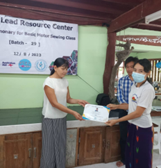 သင်တန်းတာဝန်ခံ NLD ဧရာဝတီတိုင်း တွဲဖက်အတွင်းရေးမှူး ဒေါ်ခင်လှဌေးမှ စက်ချုပ်ပညာဖြင့် ဘဝရပ်တည်မှုရှေ့ဆက်နိုင်ပြီမို့ အားပေးနေမှာဖြစ်ကြောင်း၊ အချင်းချင်းအလုပ်နေရာတွေမတူကြပေမယ့် အဆက်အသွယ်မပြတ်ကြစေလိုကြောင်း၊ ကိုယ့်နိုင်ငံအရေးအရာတွေကို မမေ့မလျော့ဘဲ နိုင်သရွေ့ပါဝင်ကူညီကြစေလိုကြောင်း ပြောကြားခဲ့ပါသည်။