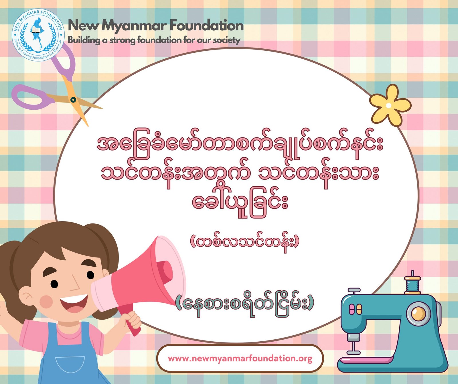 New Myanmar Foundation အနေဖြင့် မဲဆောက်ရောက် မြန်မာနိုင်ငံသားများ၏ အလုပ်အကိုင်အခွင့် အလမ်းရရှိရန်အတွက် ရည်ရွယ်လျက်လစဉ် နေ/စားငြိမ်း “အခမဲ့ အခြေခံ မော်တာစက်ချုပ်သင်တန်း” များကို ဖွင့်လှစ်ပေးသွားမည်ဖြစ်ပါသည်။ ၂၀၂၄ ခုနှစ်၊ ဧပြီလ (၂၃) ရက်နေ့တွင် ပထမအကြိမ် သင်တန်းအား ဖွင့်လှစ်သွားမည်ပြီး သင်တန်းကာလမှ ဧပြီလ (၂၃)ရက်နေ့ မှ မေလ (၂၃)ရက်နေ့ အထိ တစ်လသင်တန်း ဖြစ်ပါသည်။