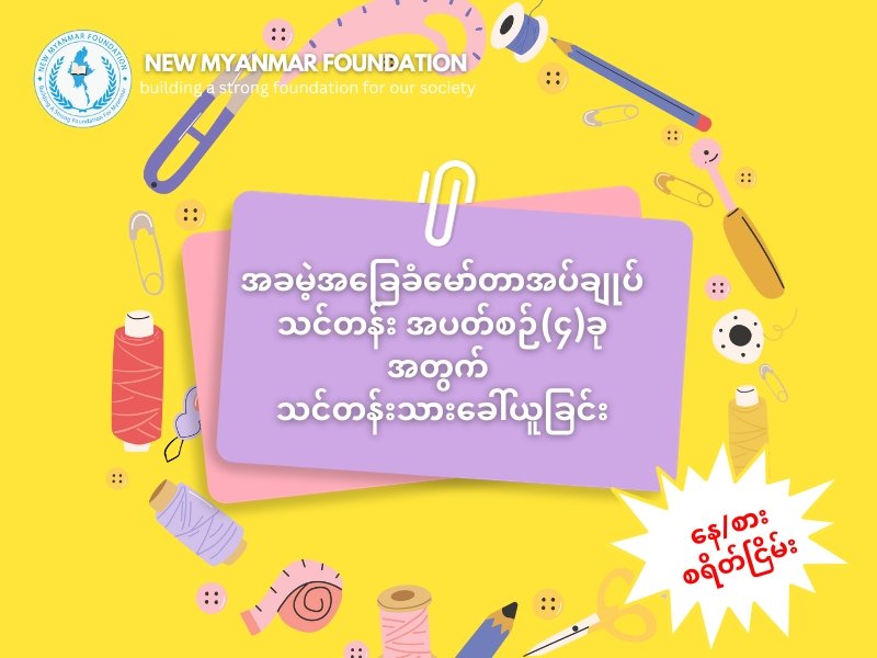 New Myanmar Foundation အနေဖြင့် မဲဆောက်ရောက် မြန်မာနိုင်ငံသား ဒီမိုကရေစီအင်အားစုများ၏ အလုပ်အကိုင်အခွင့်အလမ်းအတွက် ရည်ရွယ်လျက် (၁၀)ရက်ကြာ နေ/စား စရိတ်ငြိမ်း “အခမဲ့ အခြေခံ မော်တာစက်နင်းစက်ချုပ်သင်တန်း” ကို နိုဝင်ဘာလ နှင့် ဒီဇင်ဘာလ အတွင်း သင်တန်း အပတ်စဉ် (၄)ခု ဖွင့်လှစ်ပေးသွားမည် ဖြစ်ပါသည်။