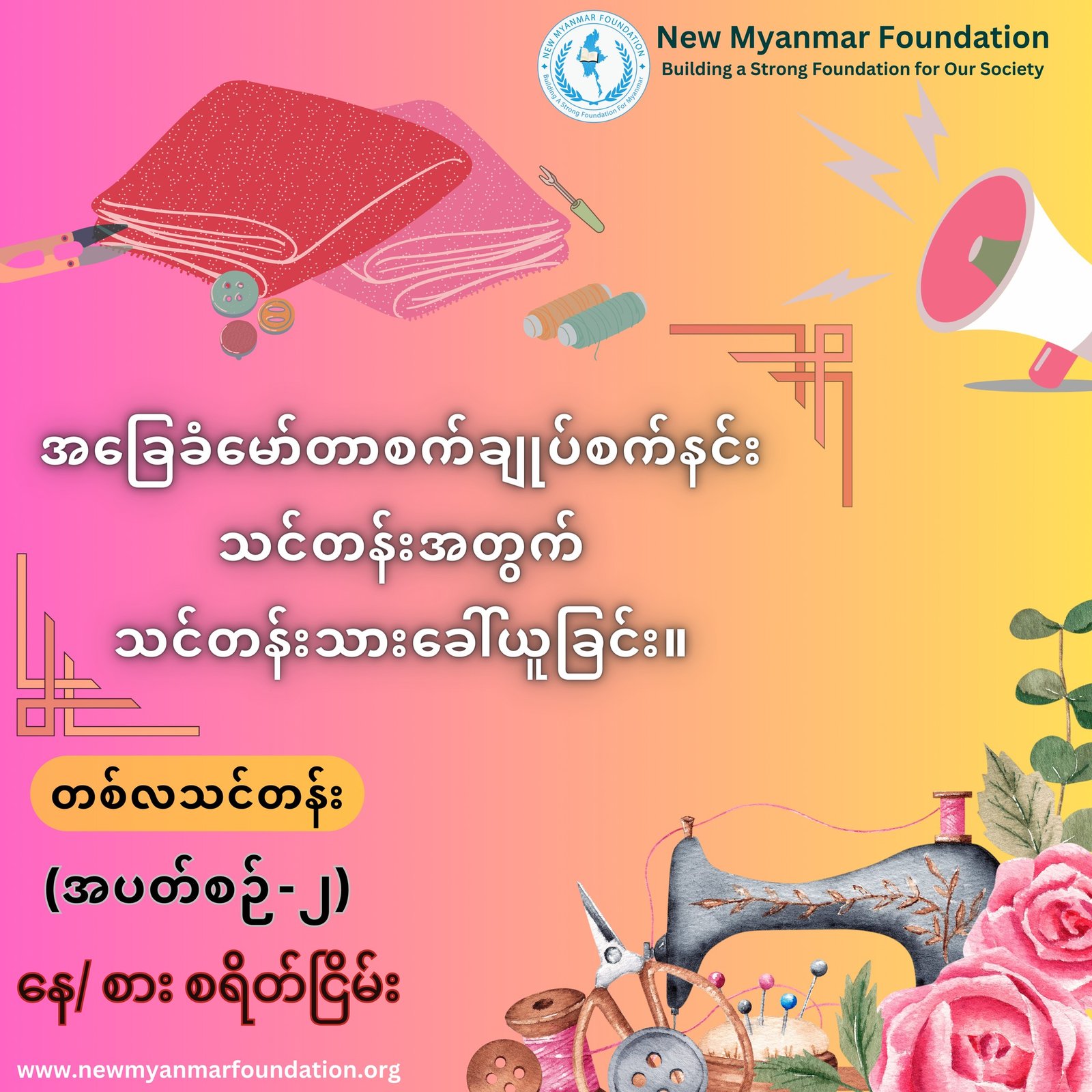 New Myanmar Foundation အနေဖြင့် မဲဆောက်ရောက် မြန်မာနိုင်ငံသားများ၏ အလုပ်အကိုင်အခွင့်အလမ်း ရရှိရန်အတွက် ရည်ရွယ်၍ လစဉ် နေ/စားငြိမ်း တစ်လကြာ “အခမဲ့ အခြေခံမော်တာ စက်ချုပ်သင်တန်း” များကို ဖွင့်လှစ်ပေးသွားမည် ဖြစ်ပါသည်။ ၂၀၂၄ ခုနှစ်၊ ဧပြီလ (၂၅) ရက်နေ့တွင် အပတ်စဉ် (၁) သင်တန်းအား ဖွင့်လှစ်ပေးခဲ့ပြီး သင်တန်းသား/ သူ (၂၀) ဦိးအား ဆရာမ (၂) ဦးဖြင့် သင်ကြားပေးနေပြီဖြစ်ပါသည်။ အပတ်စဉ် (၂) သင်တန်းအား ၂၀၂၄ ခုနှစ်၊ မေလ (၂၅) ရက်နေ့တွင် ထပ်မံဖွင့်လှစ်မည်ဖြစ်ပြီး သင်တန်းကာလမှာ မေလ (၂၅) ရက်နေ့ မှ ဇွန်လ (၂၃) ရက်နေ့အထိ တစ်လသင်တန်း ဖြစ်ပါသည်။