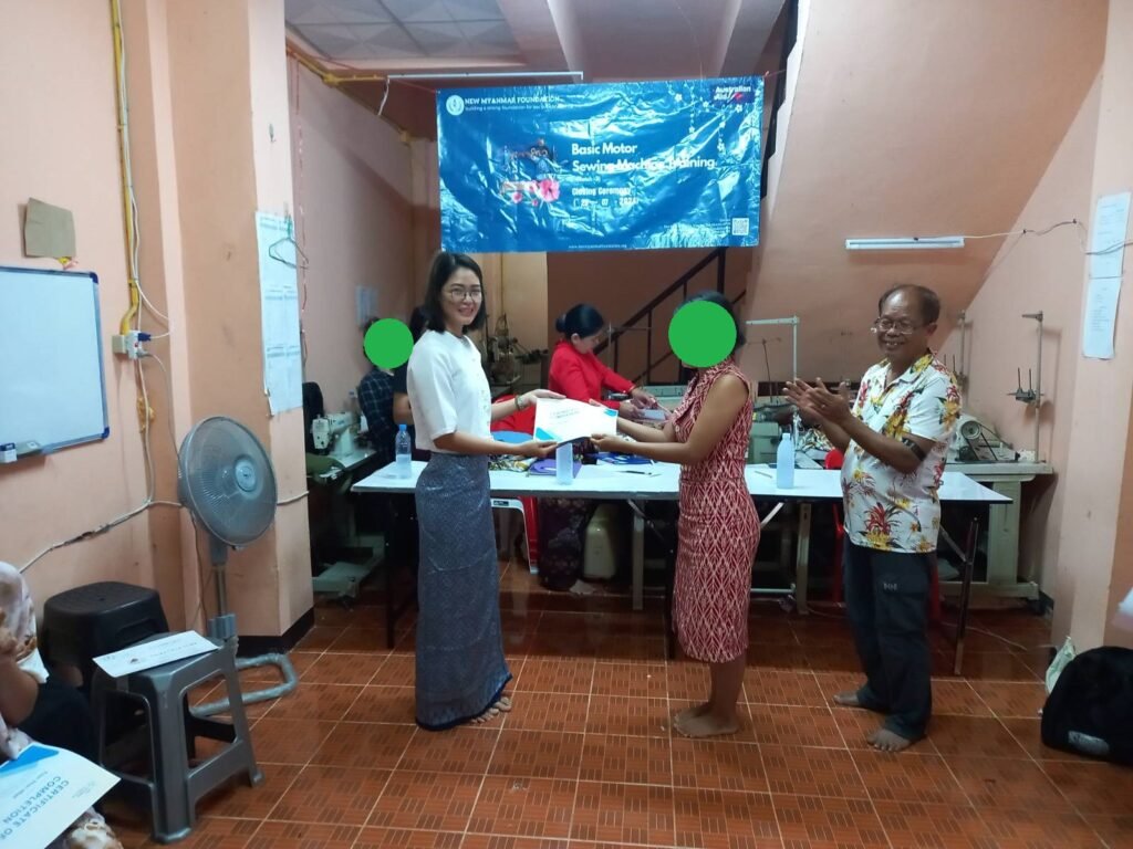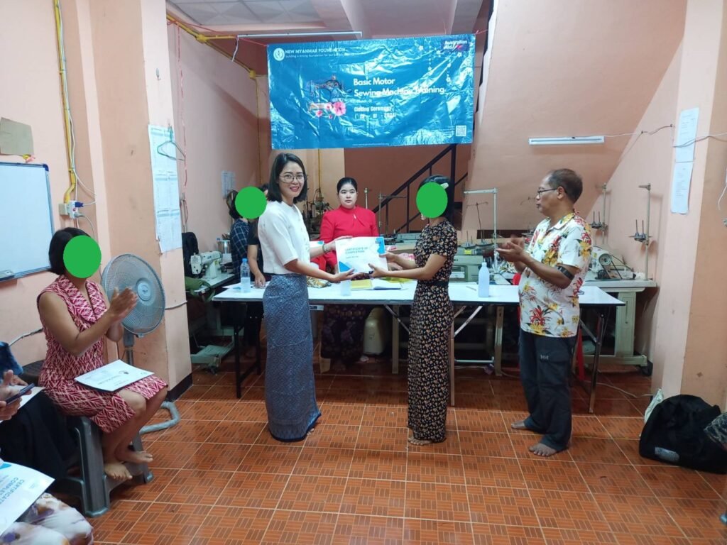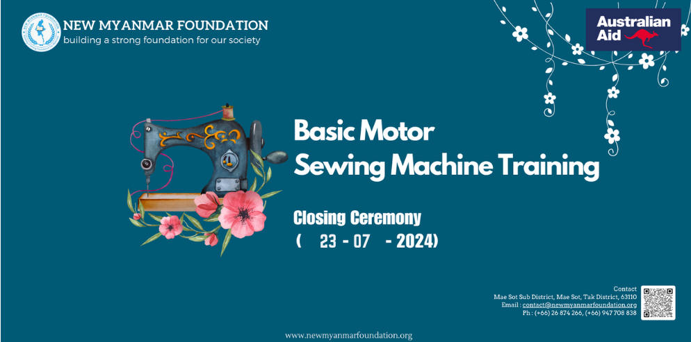 New Myanmar Foundation ၏ ၂၅-၆-၂၀၂၄ မှ ၂၃-၇-၂၀၂၄ ရက်နေ့အထိ (၁) လကြာ ဖွင့်လှစ်ပေးခဲ့သည့် အခမဲ့ အခြေခံလျှပ်စစ်မော်တာစက်ချုပ်ပညာရပ်သင်တန်း အပတ်စဉ် (၃) သင်တန်းဆင်းပွဲ ကို (၂၃-၇-၂၀၂၄) ရက်နေ့ နံနက် (၁၀) နာရီတွင် ထိုင်း-မြန်မာနယ်စပ်ဒေသရှိ Sewing Machine Training Center တွင် ကျင်းပပြုလုပ်ခဲ့ပါသည်။