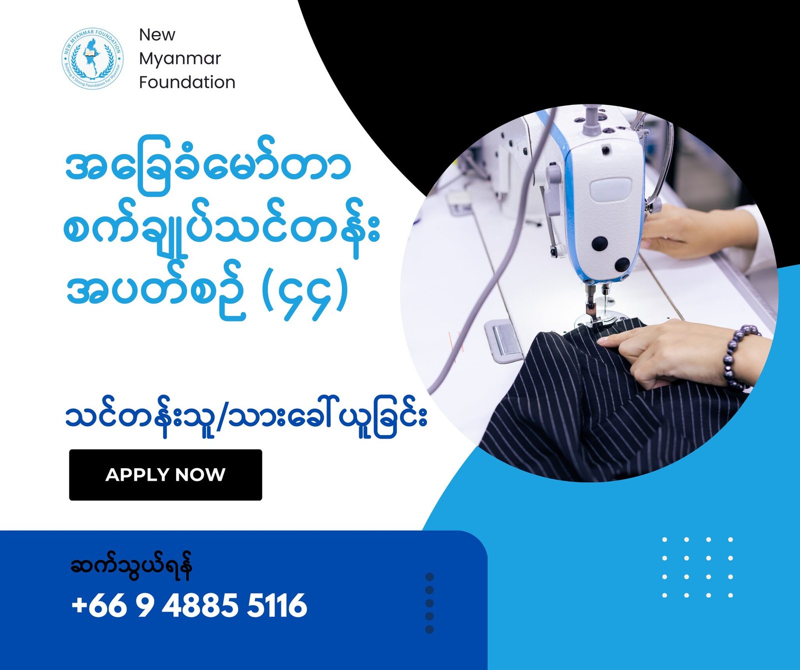 မဲဆောက်ရောက် မြန်မာပြည်သူများအတွက် အလုပ်အကိုင်အခွင့်အလမ်းရရှိရန် ရည်ရွယ်၍ New Myanmar Foundation မှ “အခမဲ့ အခြေခံမော်တာ စက်ချုပ်သင်တန်း” များကို စီစဉ်ဖွင့်လှစ်ပေးလျက်ရှိပါသည်။