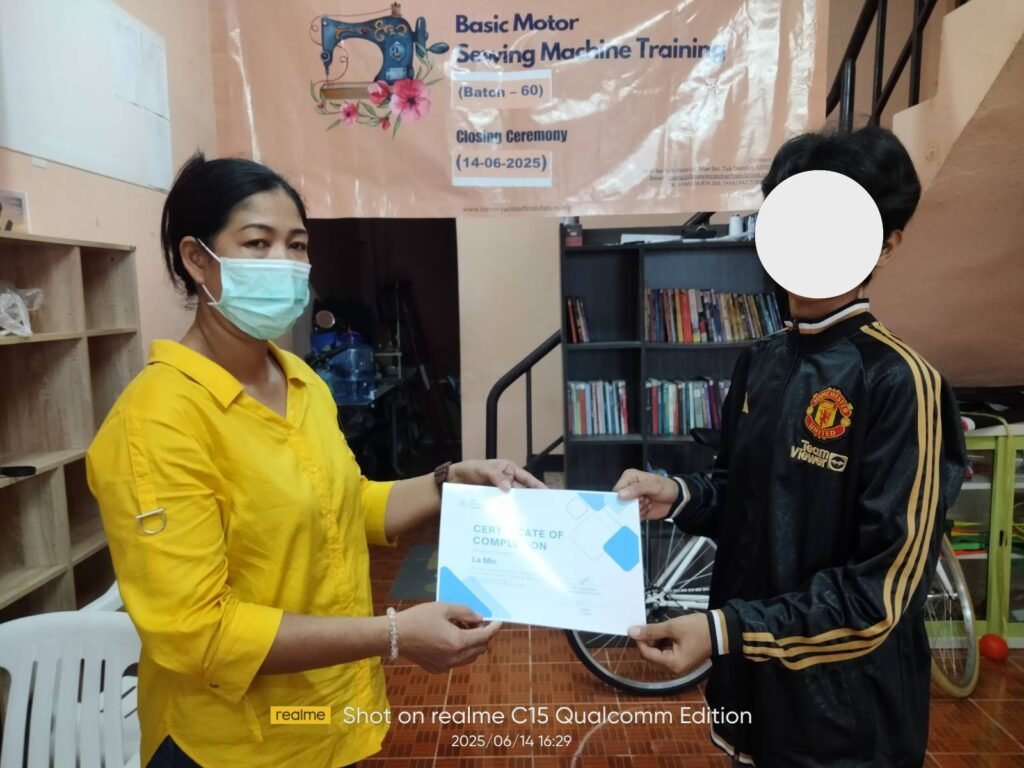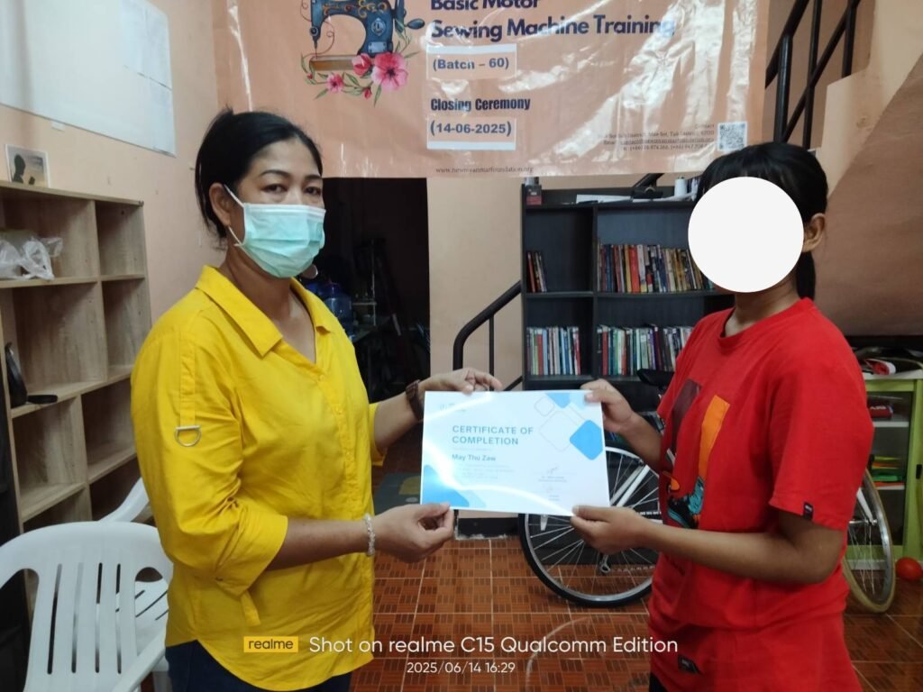 ၂၀၂၅ ခုနှစ်၊ ဇွန်လ (၄) ရက်နေ့ မှ (၁၄) ရက်နေ့အထိ (၁၂) ရက်ကြာ ဖွင့်လှစ်သင်ကြားပေးခဲ့သော New Myanmar Foundation ၏ အခမဲ့အခြေခံလျှပ်စစ်မော်တာ စက်ချုပ်သင်တန်း အပတ်စဉ် (၆၀) သင်တန်းဆင်းပွဲ အခမ်း အနား ကို ၂၀၂၅ ခုနှစ်၊ ဇွန်လ (၁၄) ရက်နေ့ ညနေ (၀၄: ၀၀) နာရီတွင် ထိုင်း-မြန်မာနယ်စပ်ဒေသရှိ နယူးမြန်မာ ဖောင်ဒေးရှင်း၏ စက်ချုပ်သင်တန်းခန်းမတွင် ကျင်းပပြုလုပ်ခဲ့ပါသည်။