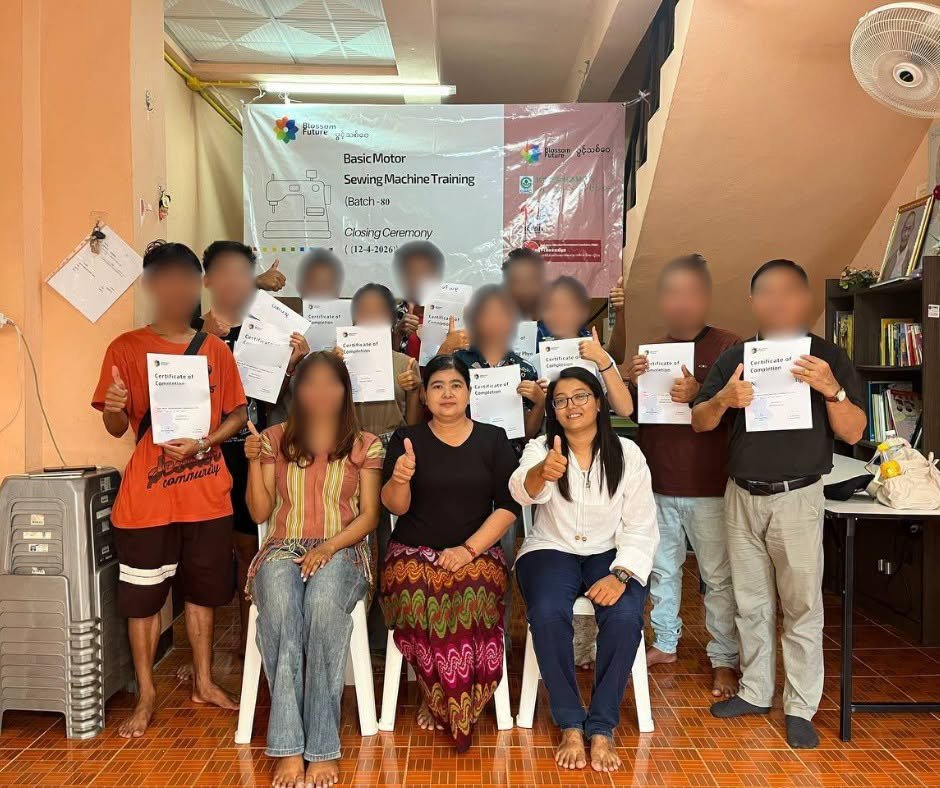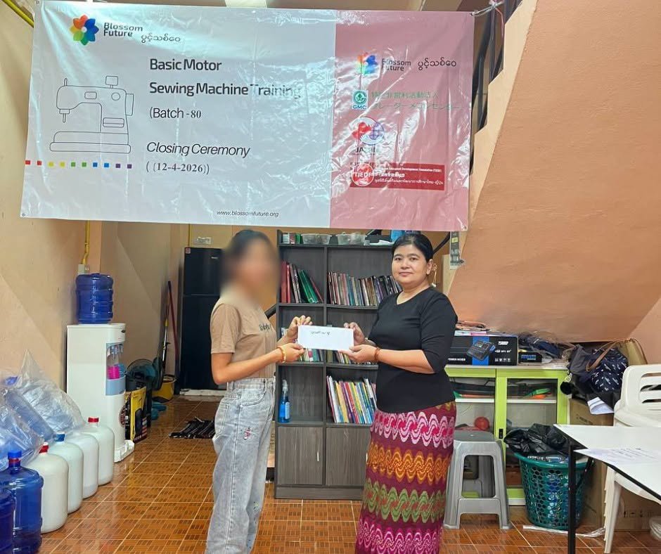 ပွင့်သစ်ဝေ (BLOSSOM FUTURE) မှ ဦးစီးကျင်းပပြုလုပ်သော (၂၀၂၆ခုနှစ်၊ ဧပြီလ(၁)ရက်နေ့မှ ဧပြီလ(၁၂)ရက်နေ့ အထိ(၁၂)ရက်ကြာ ဖွင့်လှစ်သင်ကြားပေးခဲ့သော BLOSSOM FUTURE ၏ အခမဲ့အခြေခံလျှပ်စစ်မော်တာစက်ချုပ်သင်တန်း အပတ်စဉ်(၈၀) သင်တန်းဆင်းပွဲ အခမ်းအနားကို ၂၀၂၆ခုနှစ်၊ ဧပြီလ(၁၂)ရက်နေ့ညနေ (၃:၀၀)နာရီတွင် ထိုင်းမြန်မာနယ်စပ်ဒေသရှိ ပွင့်သစ်ဝေ (BLOSSOM FUTURE) ၏ စက်ချုပ်သင်တန်းခန်းမတွင် ကျင်းပပြုလုပ်ခဲ့ပါသည်။