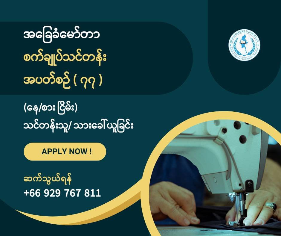 ထိုင်းနိုင်ငံ၊ မဲဆောက်မြို့သို့ ရောက်ရှိနေကြသော မြန်မာပြည်သူများအတွက် အလုပ်အကိုင် အခွင့်အလမ်းရရှိစေရန် ရည်ရွယ်၍ နယူးမြန်မာဖောင်ဒေးရှင်း မှ “အခမဲ့အခြေခံမော်တာ စက်ချုပ်သင်တန်း” များကို ၂၀၂၁ခုနှစ်၊ ဧပြီလမှစတင်၍ ဖွင့်လှစ်သင်ကြားပေးလျက်ရှိရာ သင်တန်းအပတ်စဉ် (၇၇) အတွက် သင်တန်းသား/သူ အသစ် (၁၀) ဦး ထပ်မံခေါ်ယူ သွားမည်ဖြစ်ပါသည်။ ယခုသင်တန်းတွင် လူမျိုးရေး၊ ဘာသာရေး ခွဲခြားမူမရှိဘဲ အမျိုးသမီးများနှင့် အမျိုးသားများအားလုံး ဝင်ရောက် လျှောက်ထားနိုင်ပါသည်။