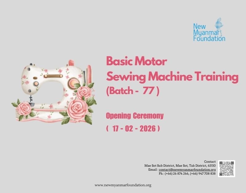 နယူးမြန်မာဖောင်ဒေးရှင်း (NMF) မှ ဦးစီးကျင်းပပြုလုပ်သော (၁၂) ရက်ကြာ “အခမဲ့ အခြေခံမော်တာ စက်ချုပ်သင်တန်း” အပတ်စဉ် (၇၇)၊ ဖွင့်ပွဲအခမ်းအနား ကို ၂၀၂၆ ခုနှစ်၊ ဖေဖော်ဝါရီလ(၁၇) ရက်နေ့၊နံနက်ပိုင်း (၉:၃၀) အချိန်တွင် မဲဆောက်မြို့ရှိ နယူးမြန်မာ ဖောင်ဒေးရှင်း၏ စက်ချုပ်သင်တန်းခန်းမ၌ ကျင်းပပြုလုပ်ခဲ့ပါသည်။