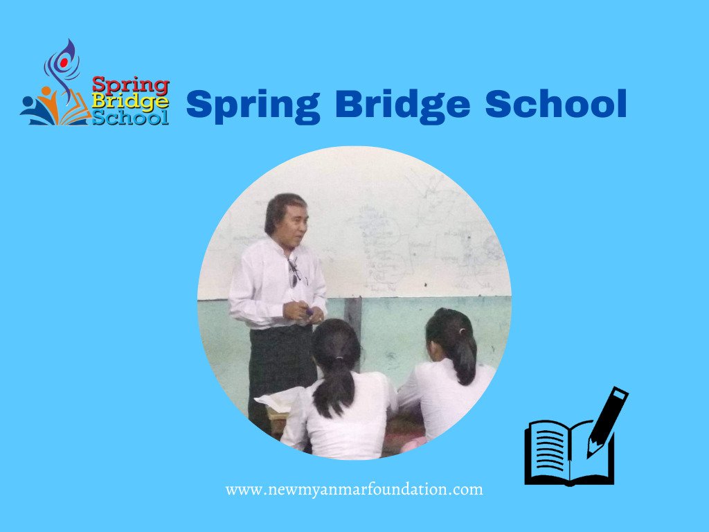 New Myanmar Foundation သည် ၂၀၂၂ မေလ (၁) ရက်နေ့စတင်ပြီး စစ်ဘေးသင့် မြန်မာနိုင်ငံသား ရင်သွေးများ၏ ပညာရေးလိုအပ်ချက်များကို ဖြည့်စည်းပေးရန်အတွက် Spring Bridge School (SBS) Online Program သို့ ကျောင်းသားများကို စတင်ဖိတ်ခေါ်ခဲ့ပါသည်။ ၂၀၂၂ ခုနှစ် ဇွန်လ (၆) ရက်နေ့ကစတင်ကာ Grade 1 မှ Grade 11 ထိ ကျောင်းသူ ကျောင်းသား ၁၂၀၀ ကျောင်ကို သင်ကြားခဲ့ပြီး ဒီဇင်ဘာလ ၂၀၂၂ ခုနှစ် တွင် အတန်းတင် စာမေးပွဲ စစ်ဆေးခဲ့ပါသည်။ ၂၀၂၃ ဇန်နဝါရီလ (၃၁) ရက်တွင် အတန်းအားလုံး၏ အောင်မြင်သော ကျောင်းသား ကျောင်းသူများကို အောင်လက်မှတ်များ ပေးအပ်ခဲ့ပါသည်။ Spring Bridge School ၏ ၂၀၂၃ စာသင်နှစ်ကို ပြန်လည် စတင်ရန် ဖေဖေါ်ဝါရီလ နှင့် မတ်လ နှစ်လအတွင်း ဆရာ၊ဆရာများနှင့် ကျောင်းသား၊ ကျောင်းသူ အသစ်များကို ဖိတ်ခေါ်လက်ခံခဲ့ပါသည်။ ဒုတိယစာသင်နှစ်ကို ၂၀၂၃ မတ်လ (၆) ရက်တွင် ပြန်လည်ဖွင့်လှစ်ခဲ့ပါသည်။ Grade 1 မှ Grade 12 ထိ ကျောင်းသား ကျောင်းသူ ပေါင်း (၁၀၀၀) ကျော်အား ဆရာ ဆရာမစုစုပေါင်း (၇၀) ကျော်ဖြင့် အတန်း (၁၈) ခုခွဲကာ သင်ကြားပေးလျှက်ရှိပါသည်။ ဤစာသင်နှစ်သည် ၂၀၂၃ အောက်တိုဘာလ ကုန်တွင်သင်ကြား ပြီးမြောက်မည်ဖြစ်ပြီး နိုဝင်ဘာလတွင် အတန်းတင်စာမေးပွဲများ ကျင်းပမည် ဖြစ်ပါသည်။