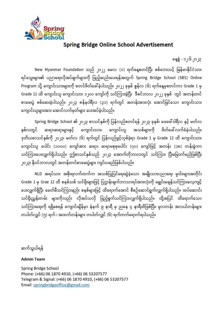 New Myanmar Foundation သည် ၂၀၂၂ မေလ (၁) ရက်နေ့စတင်ပြီး စစ်ဘေးသင့် မြန်မာနိုင်ငံသား ရင်သွေးများ၏ ပညာရေးလိုအပ်ချက်များကို ဖြည့်ဆည်းပေးရန်အတွက် Spring Bridge School (SBS) Online Program သို့ ကျောင်းသားများကို စတင်ဖိတ်ခေါ်ခဲ့ပါသည်။ ၂၀၂၂ ခုနှစ် ဇွန်လ (၆) ရက်နေ့မှစတင်ကာ Grade 1 မှ Grade 11 ထိ ကျောင်းသူ ကျောင်းသား ၁၂၀၀ ကျော်ကို သင်ကြားခဲ့ပြီး ဒီဇင်ဘာလ ၂၀၂၂ ခုနှစ် တွင် အတန်းတင် စာမေးပွဲ စစ်ဆေးခဲ့ပါသည်။ ၂၀၂၃ ဇန်နဝါရီလ (၃၁) ရက်တွင် အတန်းအားလုံး အောင်မြင်သော ကျောင်းသား ကျောင်းသူများအား အောင်လက်မှတ်များ ပေးအပ်ခဲ့ပါသည်။